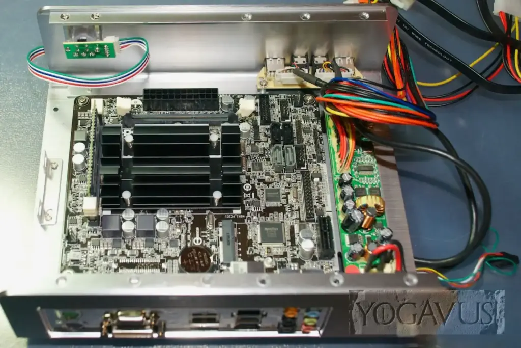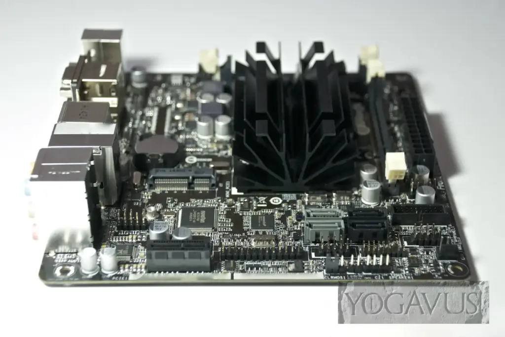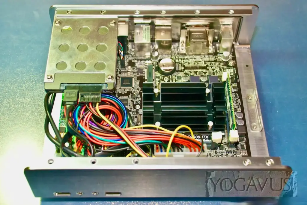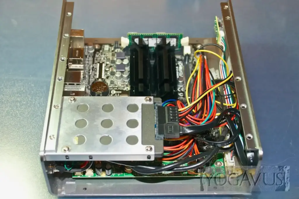 Sind nach Einsetzen der Mini-ITX Platine die Kabel vernünftig drappiert, so dass die kühle Luft durch die seitlichen Öffnungen des Alu-Gehäusedeckels den schwarzen CPU-Kühlkörper erreichen kann, dort erwärmt wird, um durch die Öffnungen im Deckel zu entströmen, so ist der Kühlung im Grunde genommen Genüge getan. Intel sieht nicht zwingend eine aktive Belüftung vor, drum hat ASRock auch auf den üblichen aufgesetzten Ventilator verzichtet.