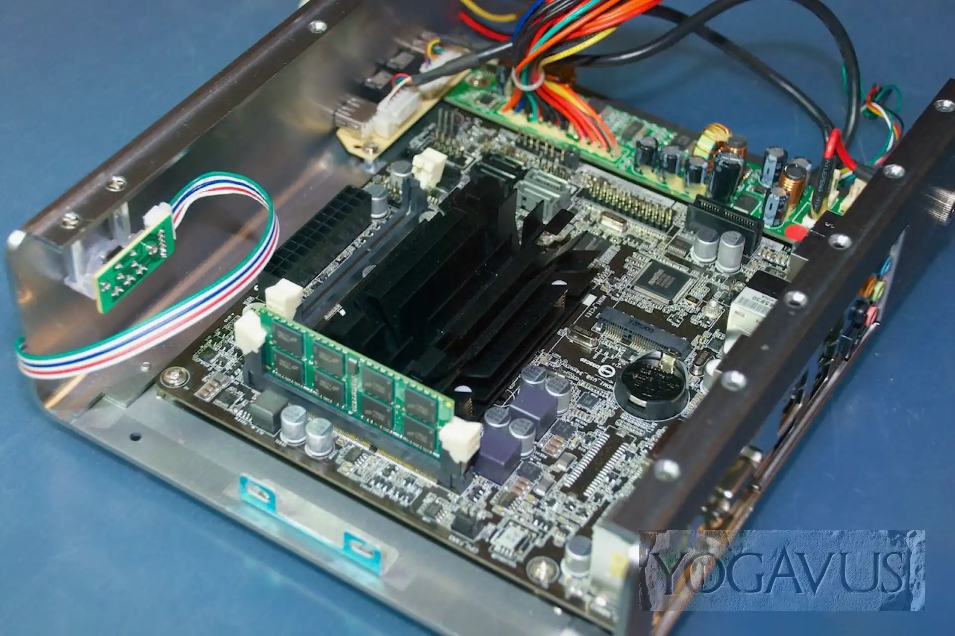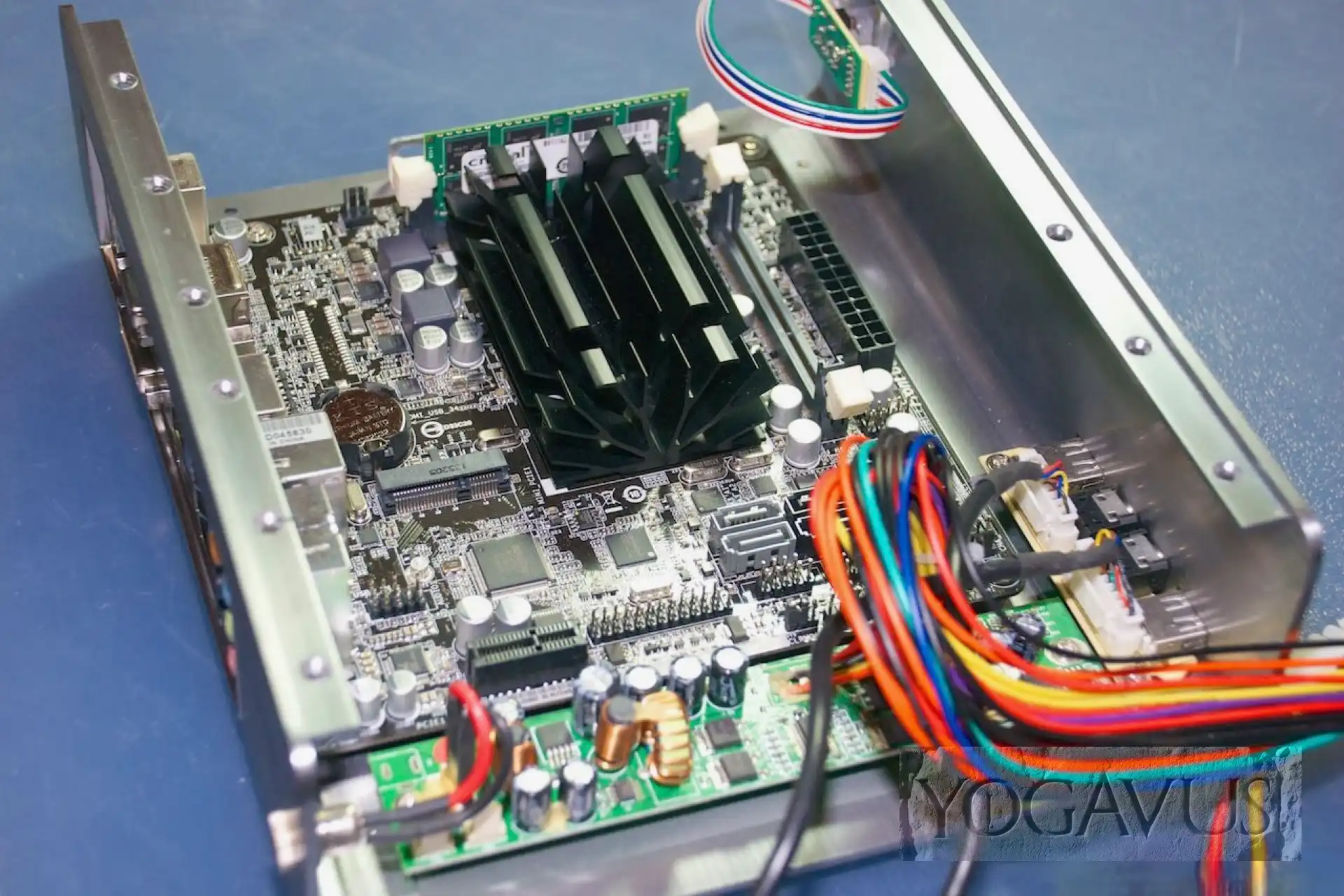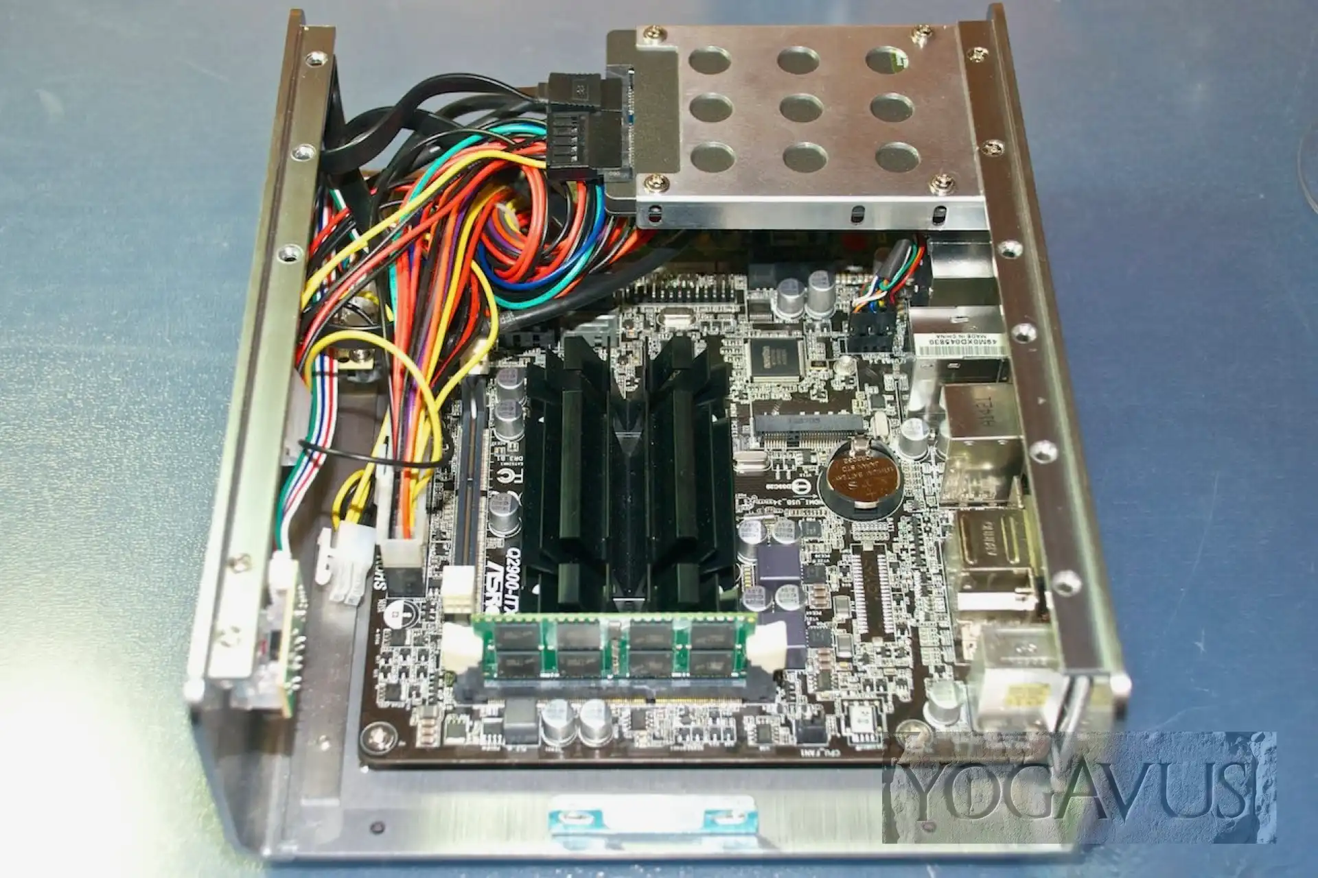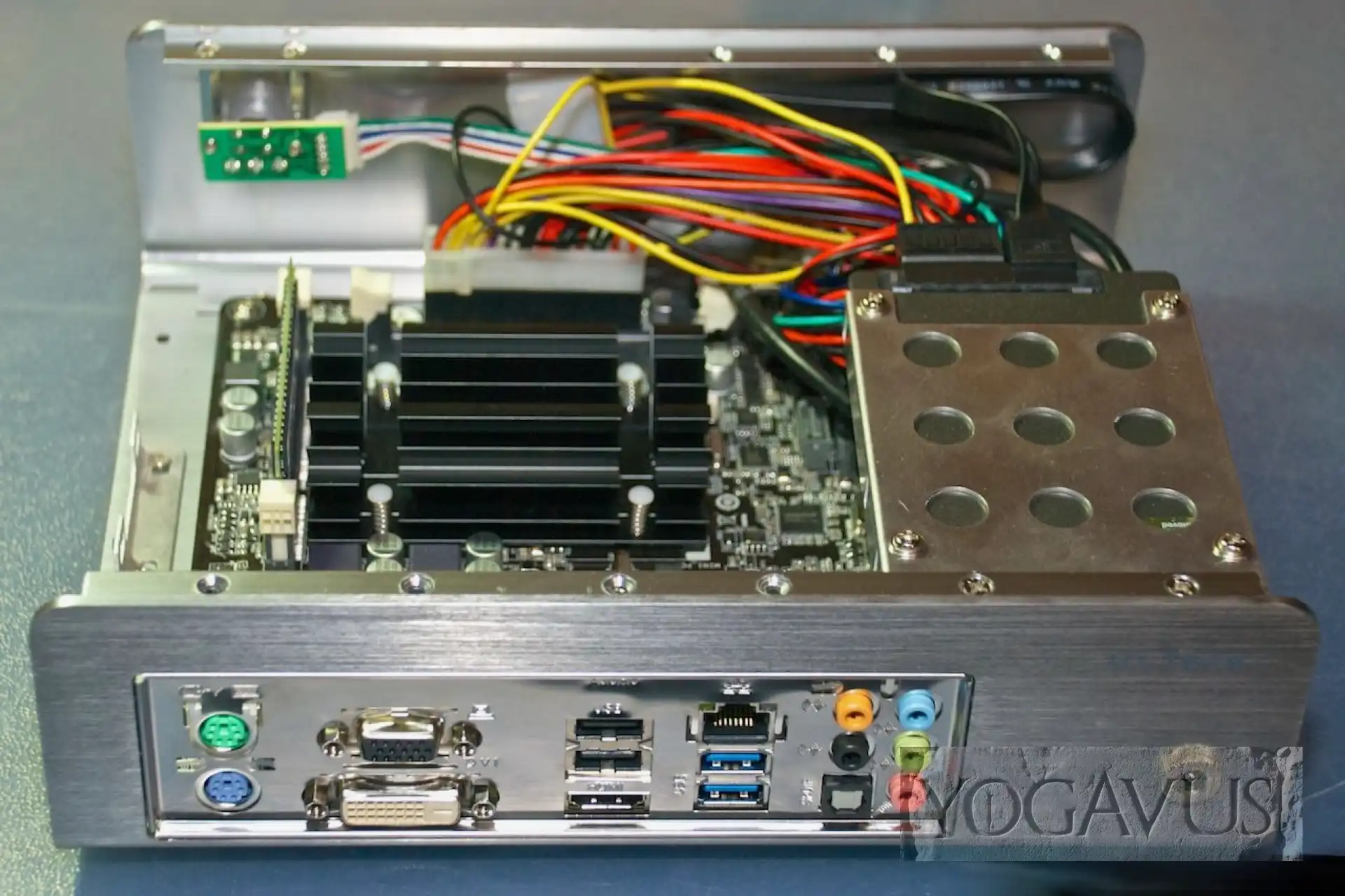 Sind nach Einsetzen der Mini-ITX Platine die Kabel vernünftig drappiert, so dass die kühle Luft durch die seitlichen Öffnungen des Alu-Gehäusedeckels den schwarzen CPU-Kühlkörper erreichen kann, dort erwärmt wird, um durch die Öffnungen im Deckel zu entströmen, so ist der Kühlung im Grunde genommen Genüge getan. Intel sieht nicht zwingend eine aktive Belüftung vor, drum hat ASRock auch auf den üblichen aufgesetzten Ventilator verzichtet.