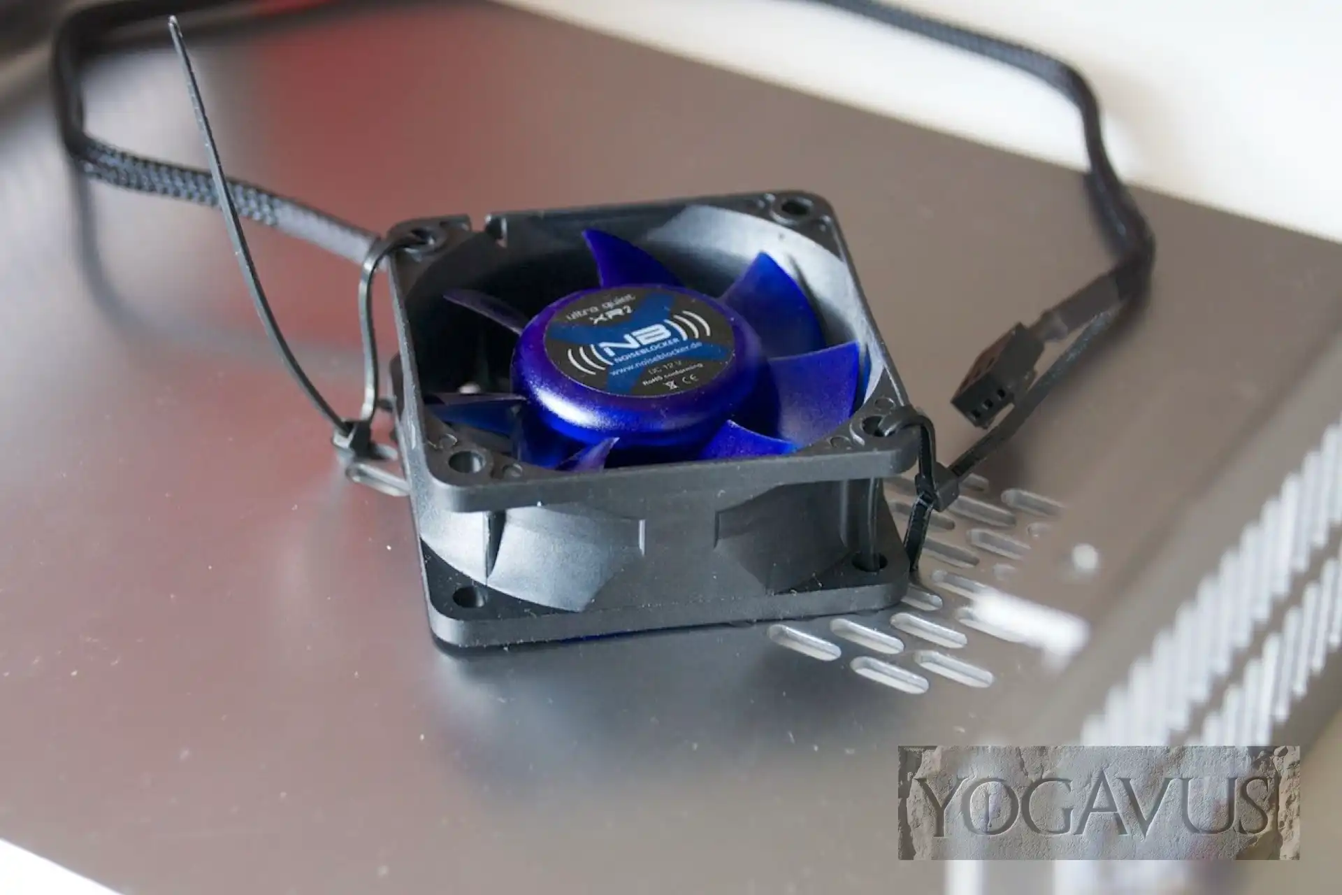 Im derart lüfterlosen Aufbau habe ich nach stundenlanger Intensivnutzung eine CPU-Temperatur von 51°C erreicht. Es soll aber nicht unerwähnt bleiben, dass der Aufstellort luftig und schattig war und der Hochsommer noch nicht seine Finger im Spiel hatte. Um mit Blick auf die warmen Monate vorzusorgen und auch im Hinterkopf, dass kühle Hardware länger lebt, haben ich doch noch einen Lüfter aus ins Boot geholt. Dieser wurde an der Unterseite des Deckels und deckungsgleich mit den Kühlöffnungen mittels Kabelbindern fixiert. Universelle Spezialexperten machen das so! 😄