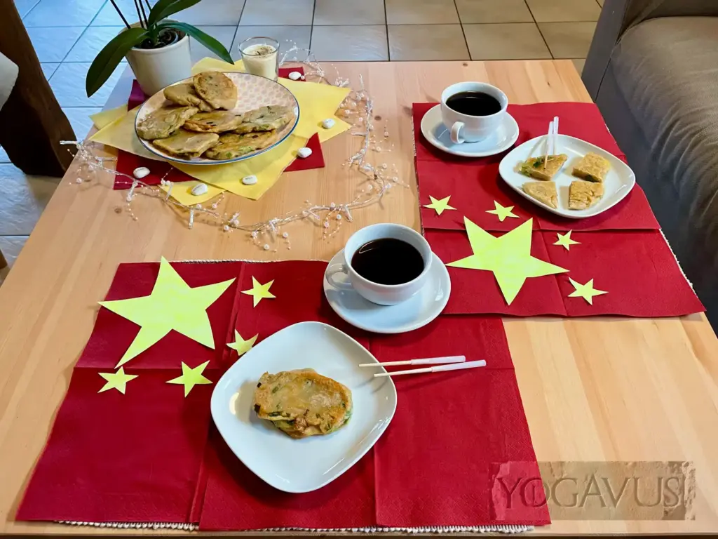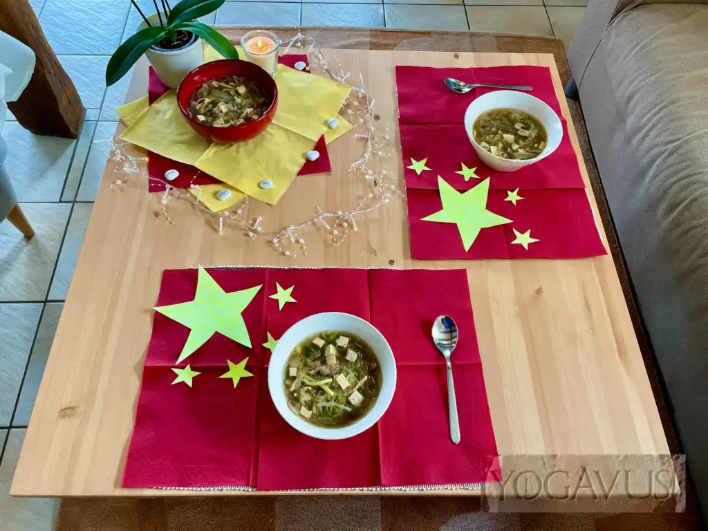 Eine schnelle Köstlichkeit von der Herdplatte nach diesem Rezept stimmt dich ein auf die kommenden Wonnen unseres Reisetages jenseits der Großen Mauer. Die Schwere unserer Gegenwart löst sich mit jedem Löffel. Solltest du keine Shitakepilze mögen, so wie wir, dann nimm auch du die freudig in die Bresche hüpfenden weißen Champignons.