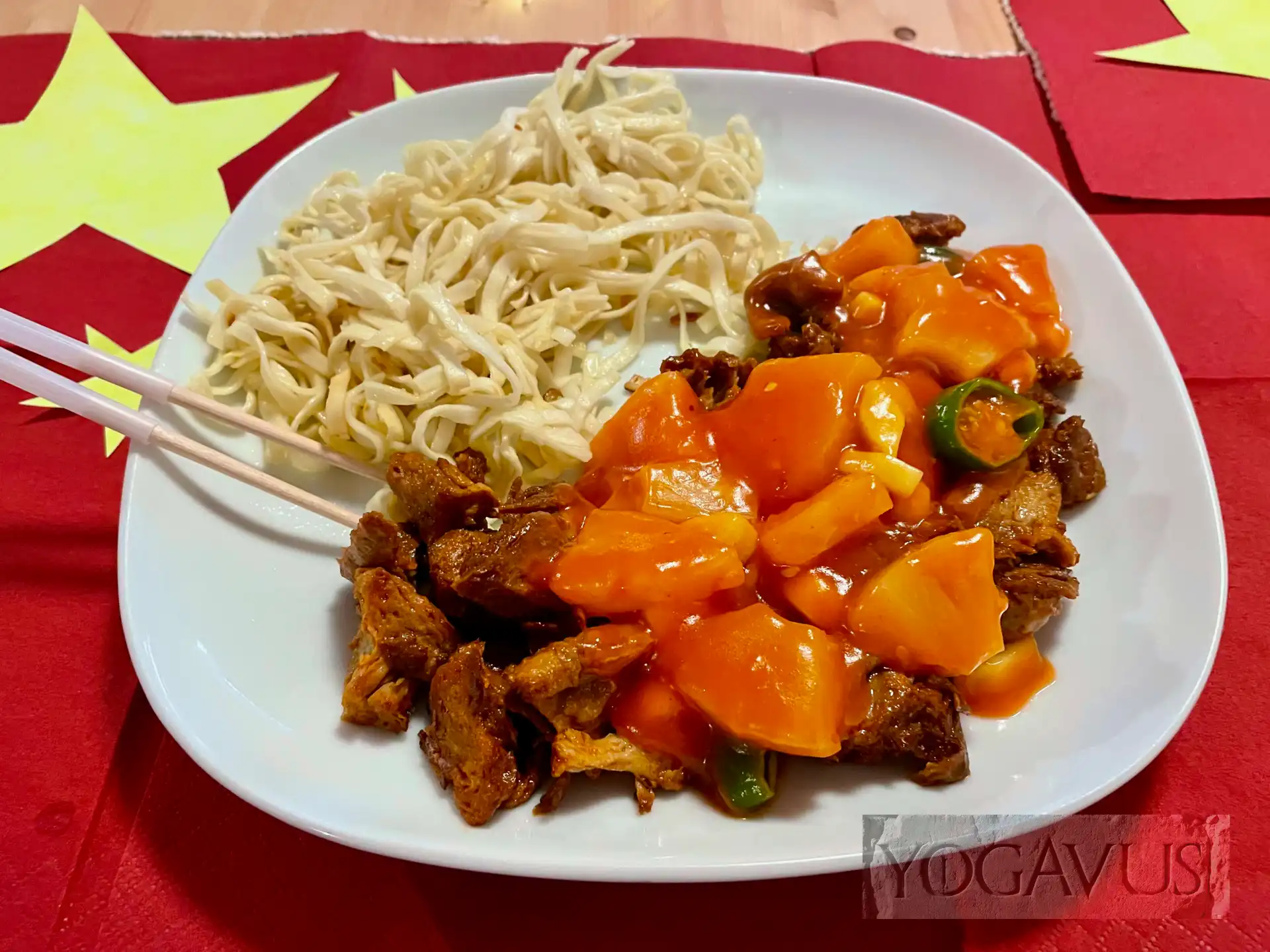 Vegane Ente an süß-saurer Soße und gebratenen Mie-Nudeln