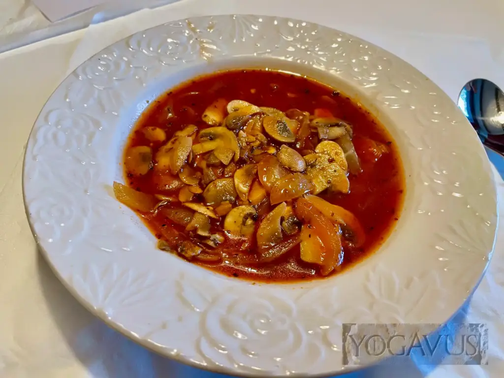 Wir starten mit der Champignon-Souppa von Seite 26, natürlich ohne die Butter, die Eier und den Käse. 🙂 Ehrliche mafiamäßig heiße Suppe. Genau das Richtige, um uns auf den ersten Gangsterfilm vorzubereiten.