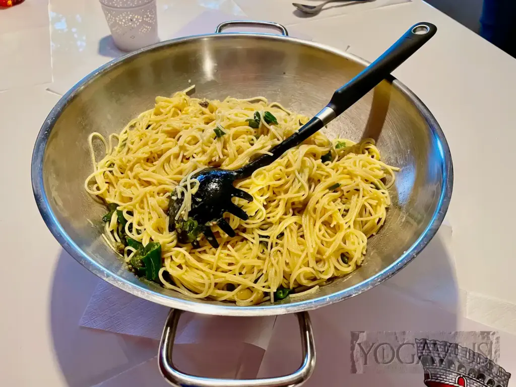 Unser gemeinsames Abendessen kommt ebenfalls aus dem nur noch gebraucht erhältlichen Mafia-Kochbuch. Auf Seite 34 ist das so simple und doch mafiamäßig nahrhafte Pastagericht mit den grünen Paprika. Schnell ist es veganisiert. Gutes Olivenöl und grüne Paprika stimmen das Jungvolk auf die Nachtruhe ein und die Älteren auf DAS große Meisterwerk des Mafiafilms.