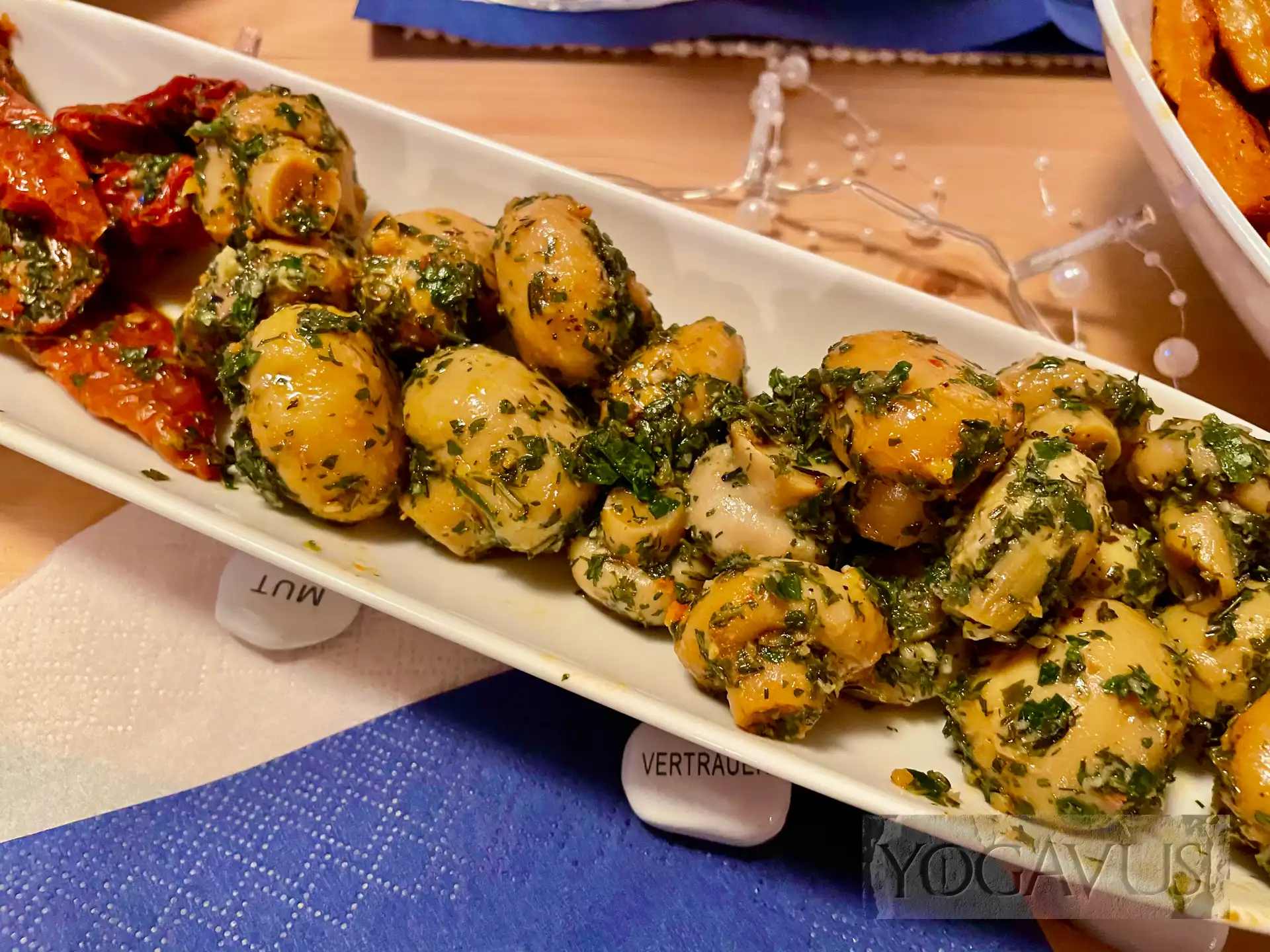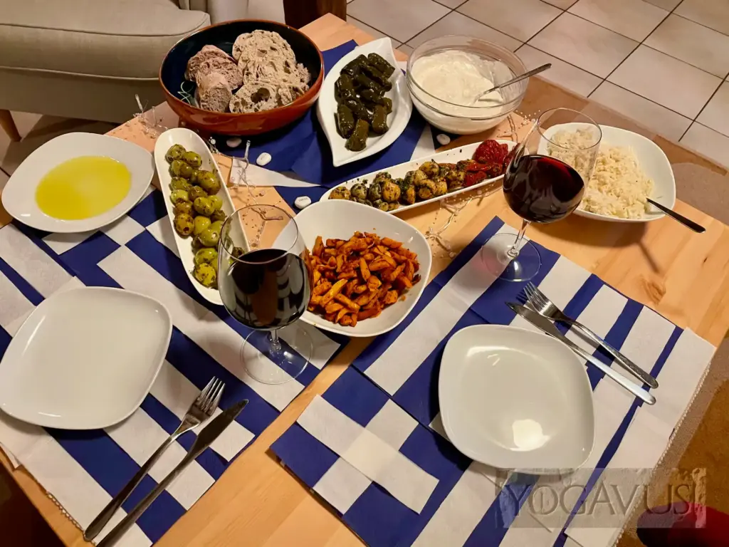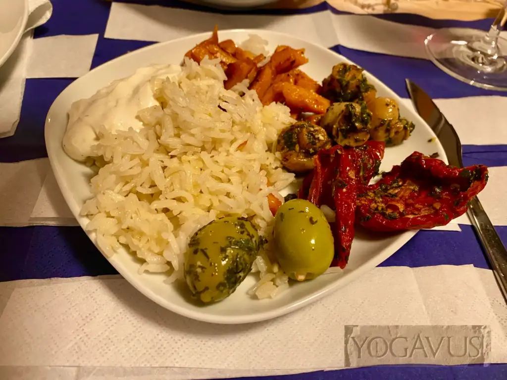 Frisches Brot mit bestem grün-schwerem Olivenöl, unter lachender Sonne getrockneten Tomaten, gewürztem Reis in Weinblättern, kräuterliebkosten Oliven, unserem Zaziki vegan à la …, prima “Like Gyros” von Like Meat und eingelegten Champignons, so gestaltet sich Genuss ohne Tierleid. Ahimsa.