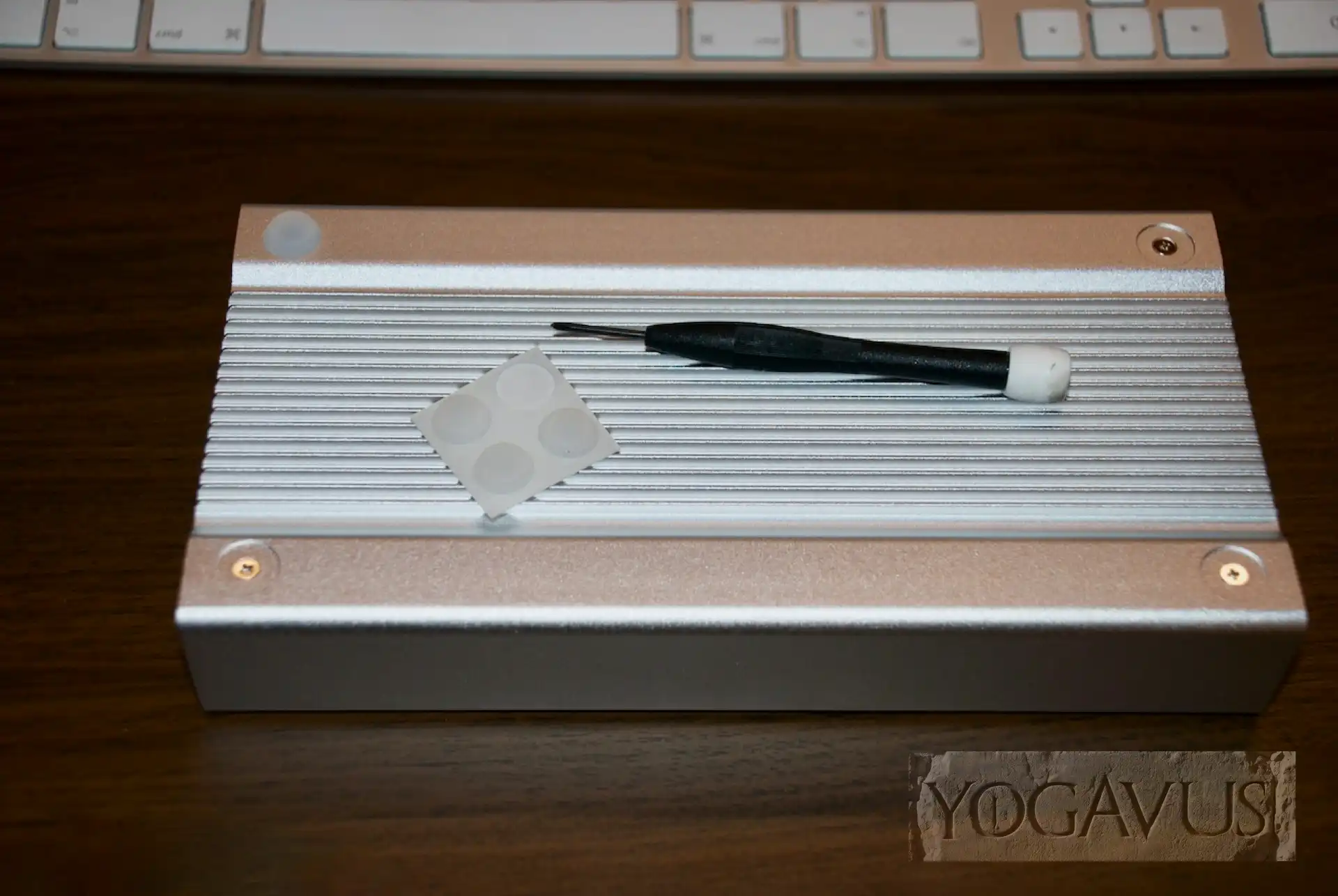 Mustergültig vollständig fällt der Lieferumfang und die herstellerseitige Vorbereitung des SK-3500 Super-S Combo aus. Alle Kabel sind enthalten und klugerweise ist im Neuzustand das Gehäuse nicht komplett verschraubt. Alles ist sehr passgenau und ich finde keine scharfen Kanten, was erfahrungsgemäß leider nicht selbstverständlich ist. Wir stecken das SATA-Stromkabel und das SATA-Datenkabel auf die SSD, setzen dann die SSD bäuchlings in den Einbauchschacht und mit der Buchsenseite in Rchtung der SATA-Stecker vom SK-3500. Nun werden an der Unterseite des SK-3500 die 4 passenden Schrauben an den tiefsten Bohrungen zum Halten der SSD verschraubt. Der Schlitten mit dem Innenleben wird nun von hinten wieder in das äußere Aluminiumgehäuse geschoben. Nun von unten das Gehäuse mit den 2 alten Schrauben und den 2 neuen aus dem Tütchen verschrauben und an die 4 Mulden werden die 4 Gummi-Füßchen geklebt. Das war’s schon.