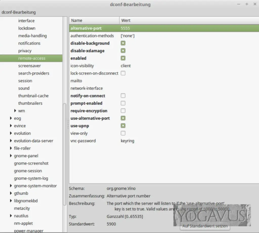 In diesem Fenster dconf-Bearbeitung findet ihr Links unter dem Pfad org>gnome>desktop>remote-access rechts ein paar Einstellmöglichkeiten. Wichtig ist natürlich enabled und sofern ihr den Port anders setzt, auch das Anklicken des Menüpunktes ‚use-alternative-port‘. Nachfolgend ein Screenshot. Fenster schließen.
