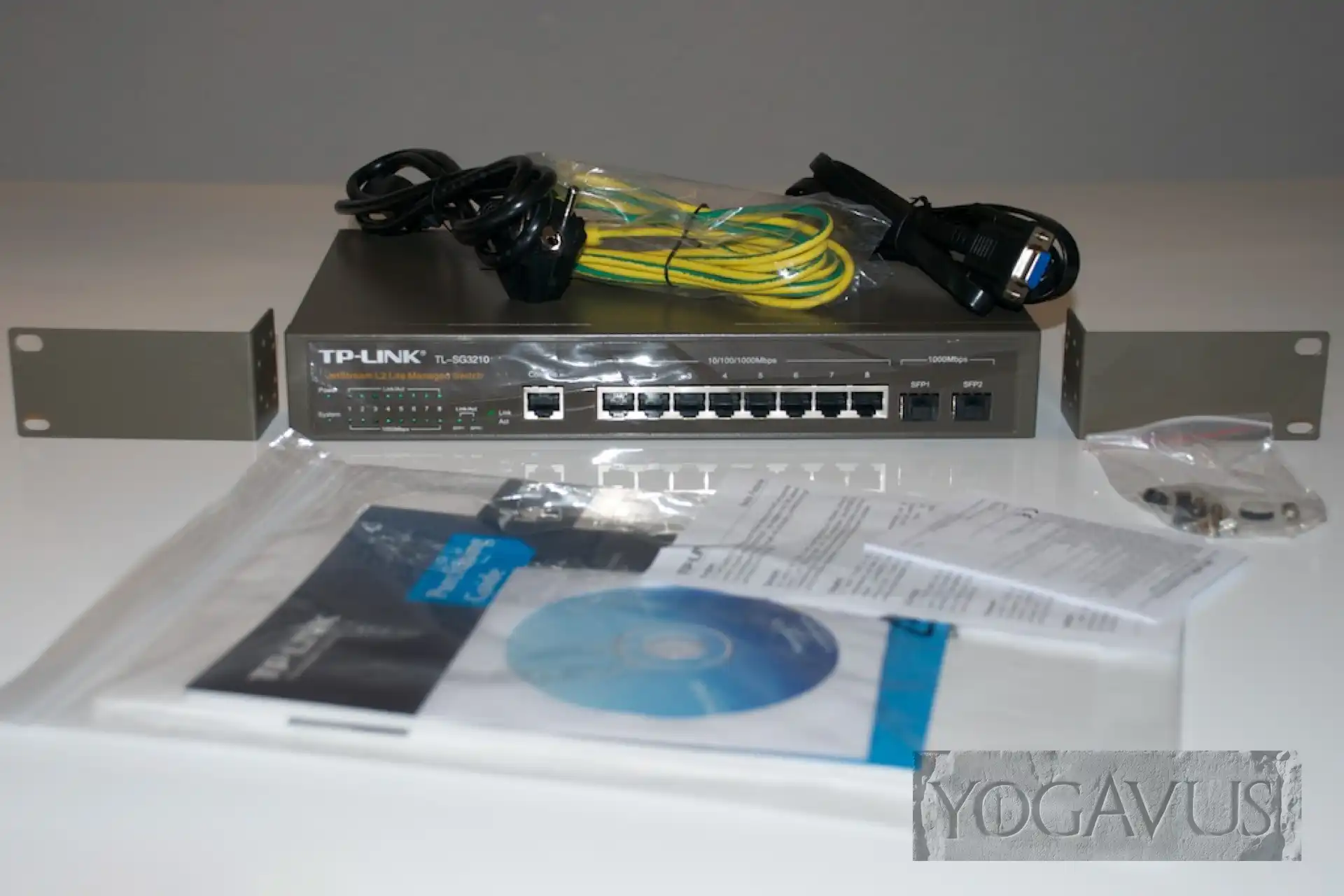– Winkel und Schräubchen für die Montage des robusten Metallgehäuses des TP-SG3210 im 19″-Rack sind anbei. So soll’s sein! Sogar ein Erdungskabel liefert TP-Link mit, welches dann den Switch mit der Erdungsschiene des Serverschranks verbindet, sofern der Fachmann in Form eines Elektrikers (Stichwort Potentialausgleich) das Rack zuvor fachmännisch geerdet hat. Aber natürlich muss man den Switch nicht im Rack betreiben. Logo. Man kann das Ding auch auf den Tisch packen und gut.