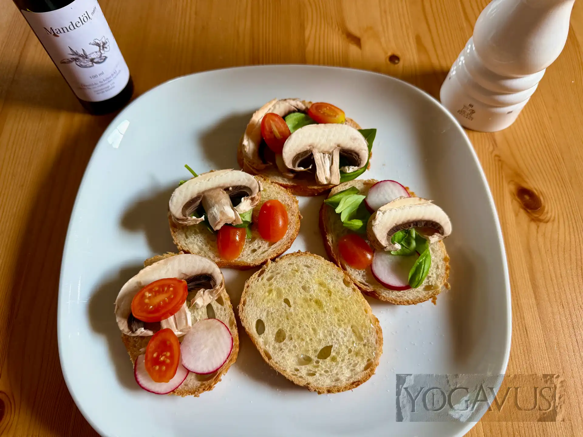 Um dieses Geschenk zu ehren, habe ich mir heute etwas Besonderes einfallen lassen: frisches Baguette, in Scheiben geschnitten, beträufelt mit dem köstlichen Münsteraner Mandelöl und einer zarten Prise Meersalz obendrauf. Hier und da ein Basilikumblättchen aus dem Gurugarten, ein wenig Radieschen, etwas vom rohen Champignon, herrje, wie schön kann das Leben eigentlich sein. Jeder Bissen ein Fest für die Sinne.