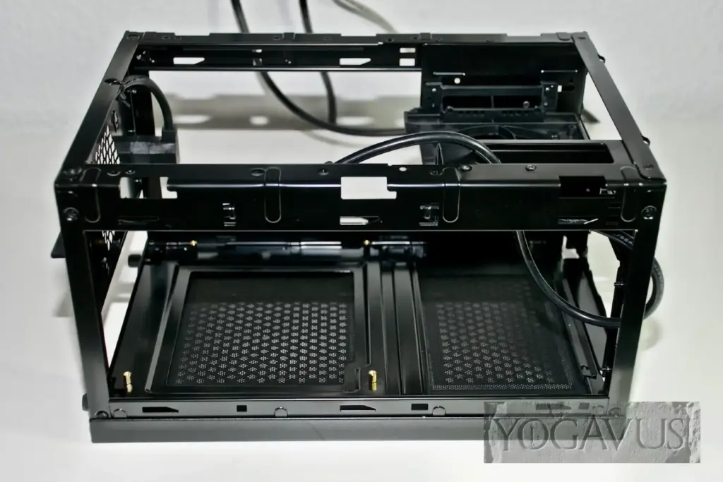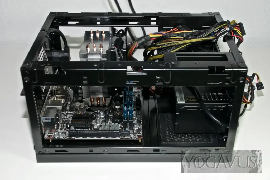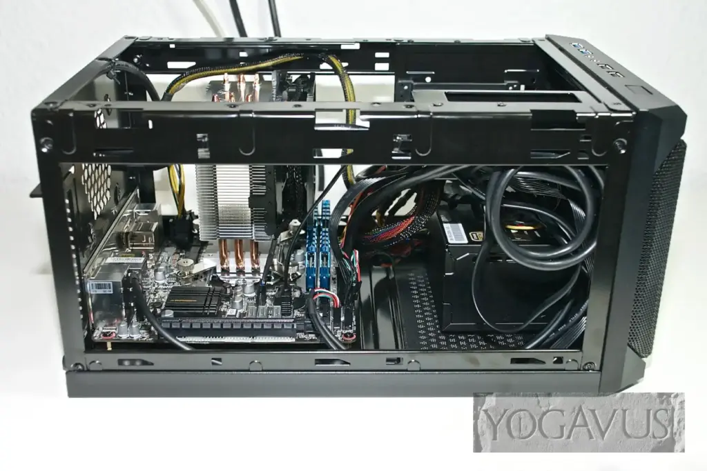 Da es aber auch bedeutend kleinere Mini-ITX-Behausungen gibt und sich hier beim QB One in Sekunden Deckel, Boden, Seitenteile und Front abnehmen lassen, sollte mit etwas Ruhe und gutem Willen auch Doppel-Linkshändern der erfolgreiche Zieleinlauf gelingen.