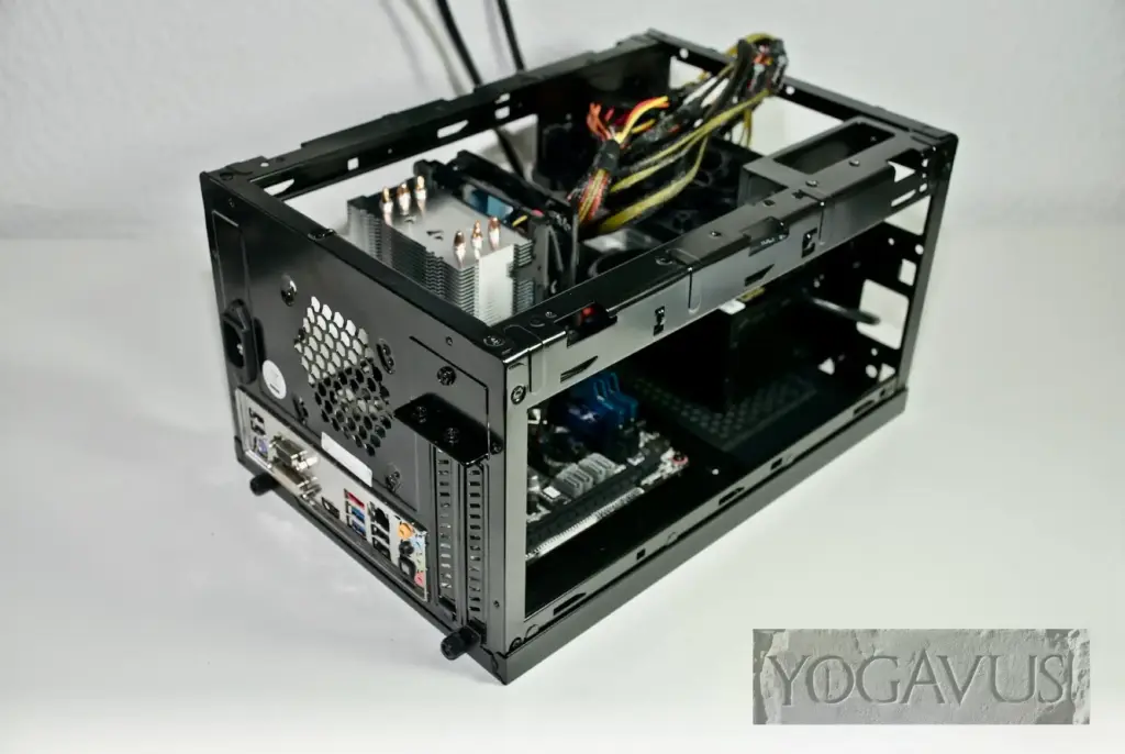 In der Summe kommt die behandelte Konfiguration auf etwa 700 EUR. Als passendes Mainboard nehmen wir das mittlerweile als sehr robust geschätzte ASRock B85M-ITX. Es stellt unserem i5-4590 an der rückwärtigen Anschlussleiste vor allem jeweils eine DVI- und eine HDMI-Schnittstelle zur Verfügung. Zudem ist neben den 4 internen SATA3 Buchsen ebenfalls hinten ein eSATA-Slot verfügbar.