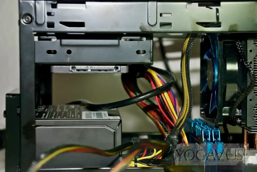 Nun nehmen wir die Samsung SSD, und bugsieren diese von unten und mit dem ‚Bauch‘ nach oben an die Metallfläche mit den vier für 2,5″-Geräte deklarierten Bohrungen. Von oben setzen wir die vier pssenden Schrauben. Die Anschlüsse der SSD sollen dabei übrigens von vorn betrachtet nach links zeigen, nur so klappt es hinterher leicht mit dem SATA-Datenkabel. Man beachte hierzu bitte unsere Foto von der montierten SSD. Abschließend wird wieder der Kunststoffträger im Probellerdesign montiert.