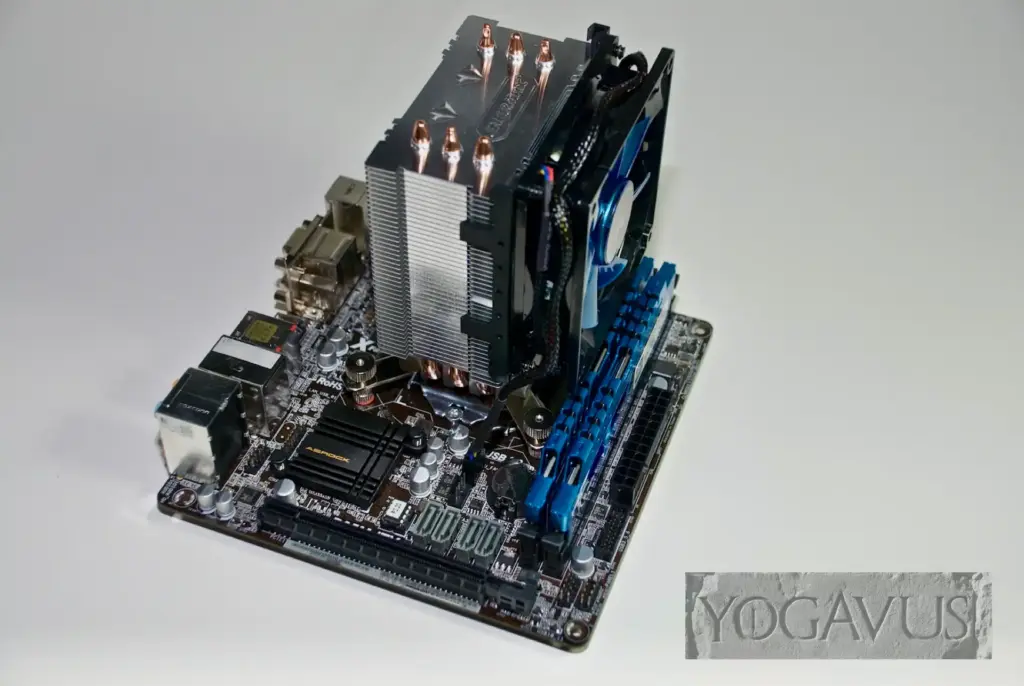 Jetzt sollte man ein Antistatik-Set verwenden: Außerhalb des Gehäuses wird nun am Mainboard die CPU gesteckt und der Enermax Prozessorkühler mittels der diesem Produkt beiliegenden Anleitung montiert. Ich empfehle als Wärmeleitpaste in jedem Fall das in der Liste genannte Arctic MX-2. Das Käbelchen des Lüfters wird passend am Mainboard gesteckt und die beiden Speichermodule kommen jetzt ebenfalls in ihre Slots.