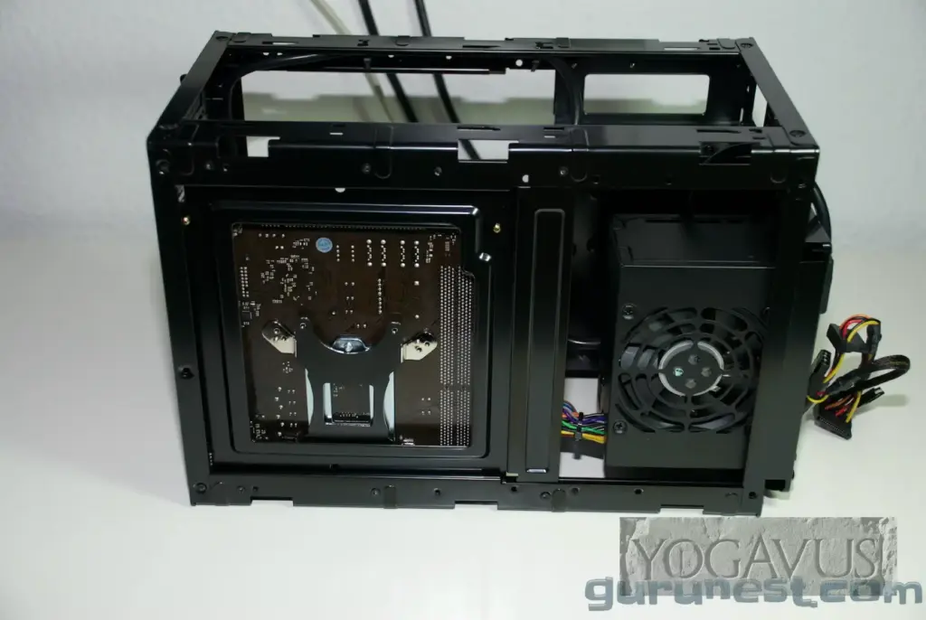 Von der Seite bewegen wir das Netzteil in das Gehäuse, setzen es vorne an der Aussparung am QB One Chassis an, wie auch auf unserem Foto abgebildet. und verschrauben es von außen mit den vier passenden Schrauben aus dem Schraubentütchen des Sharkoon QB One. Der kleine Kaltgerätestecker, welcher fest an der hinteren Buchse montiert ist und den Anschluss nach vorn zum Netzteil durchführt, wird jetzt fest in das Netzteil gesteckt.