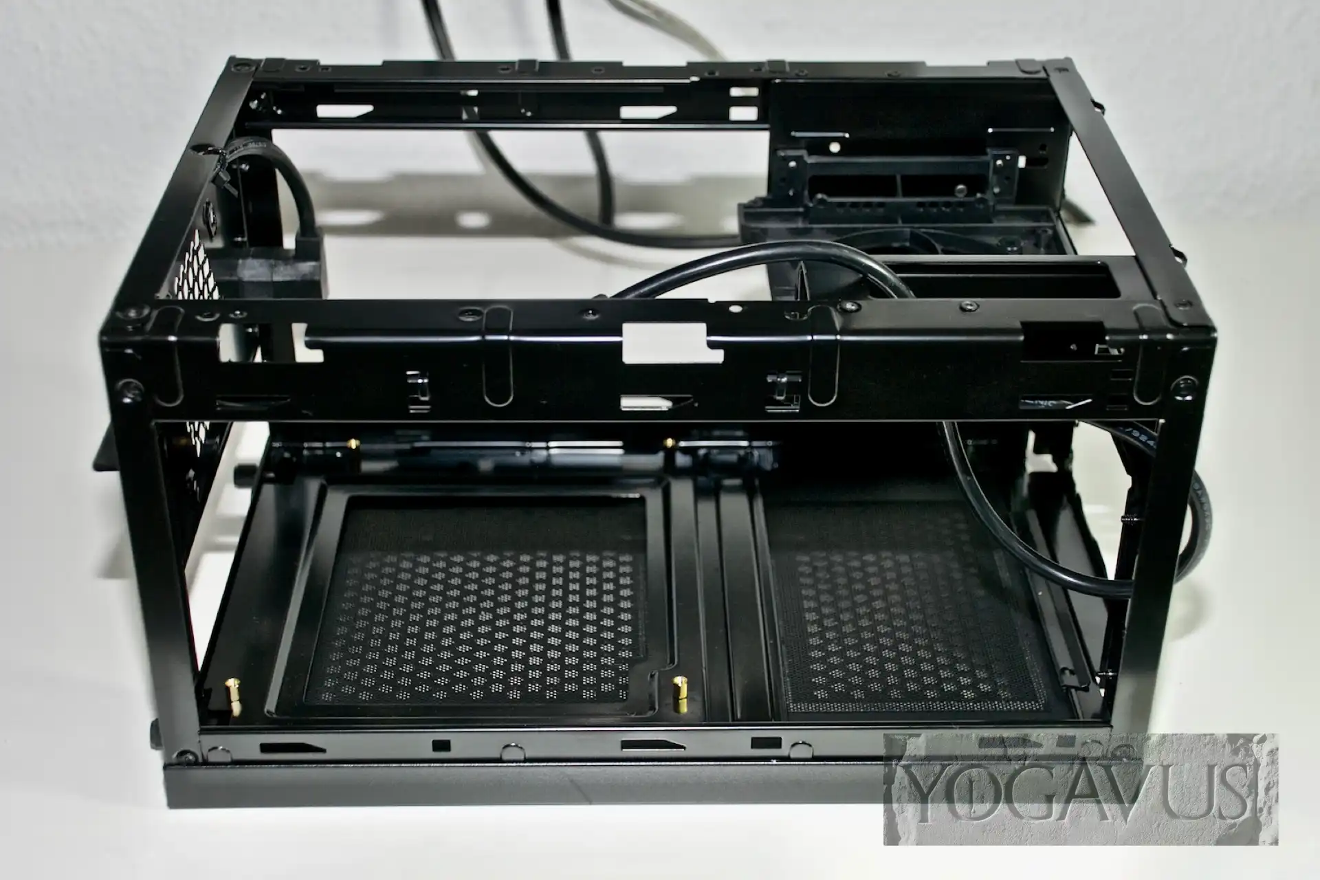 Wir nehmen das Sharkoon QB One und entfernen idealerweise gleich Deckel, Boden und die zwei Seitenwände ganz simpel per Lösen der Rändelschrauben mit den Fingern. In unserem Aufbau werden wir den mitgelieferten Lüfter am Deckel des QB One nicht nutzen, da dieser unserem Kühler im Wegen sein würde und zudem nicht so ganz das gelbe vom Ei zu sein scheint.