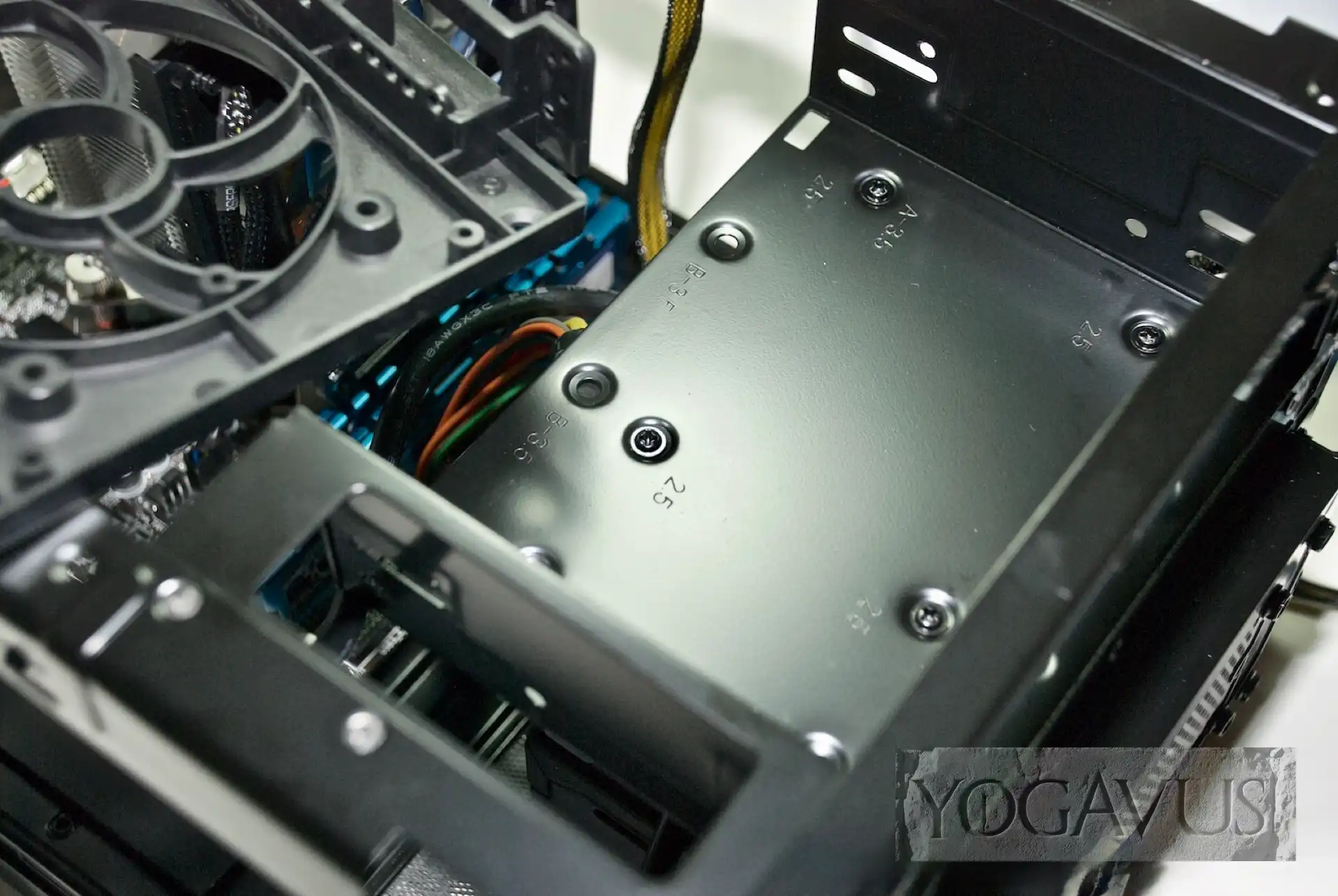 Nun nehmen wir die Samsung SSD, und bugsieren diese von unten und mit dem ‚Bauch‘ nach oben an die Metallfläche mit den vier für 2,5″-Geräte deklarierten Bohrungen. Von oben setzen wir die vier pssenden Schrauben. Die Anschlüsse der SSD sollen dabei übrigens von vorn betrachtet nach links zeigen, nur so klappt es hinterher leicht mit dem SATA-Datenkabel. Man beachte hierzu bitte unsere Foto von der montierten SSD. Abschließend wird wieder der Kunststoffträger im Probellerdesign montiert.