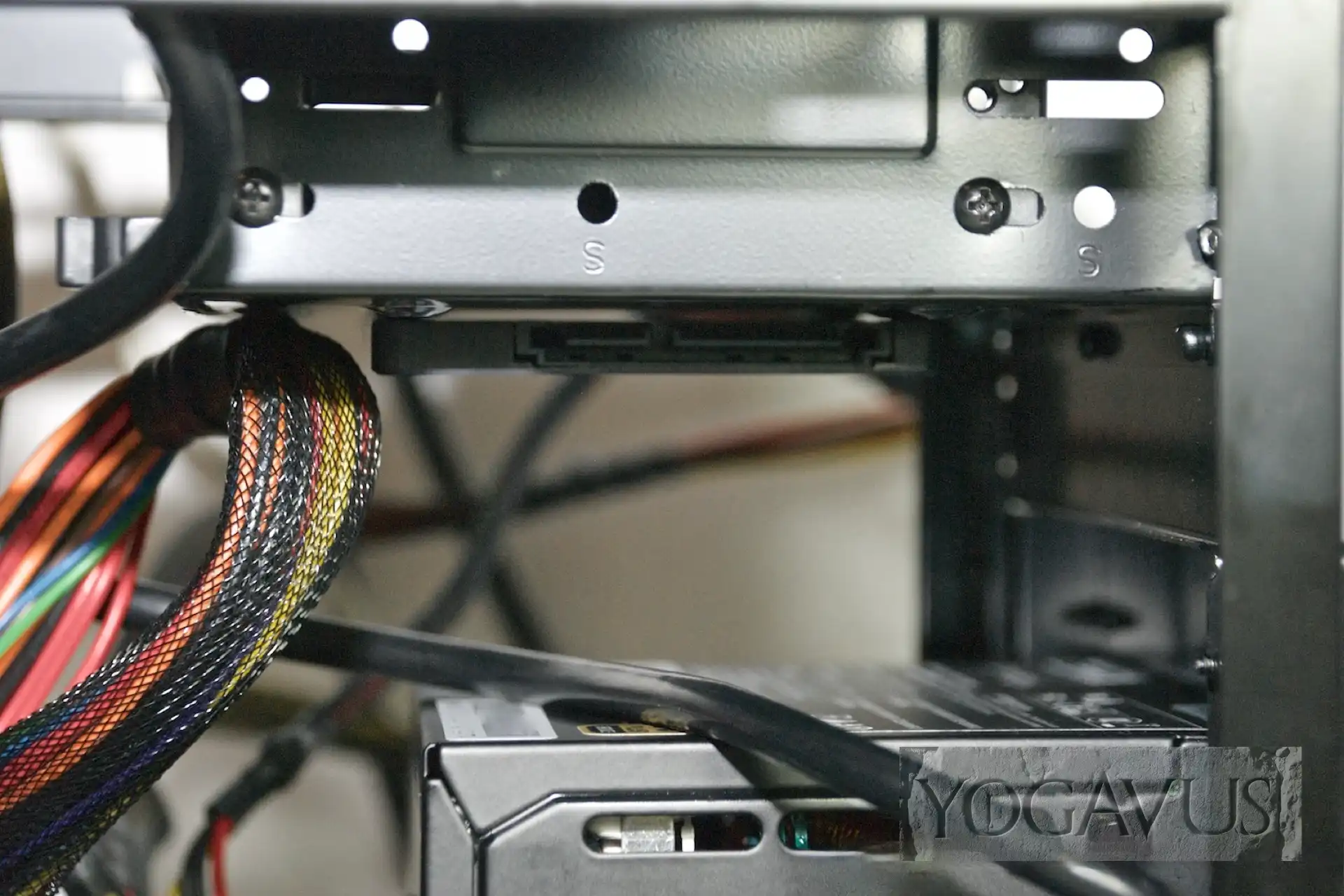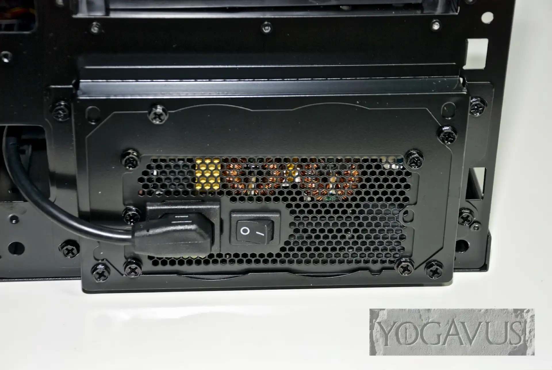 Von der Seite bewegen wir das Netzteil in das Gehäuse, setzen es vorne an der Aussparung am QB One Chassis an, wie auch auf unserem Foto abgebildet. und verschrauben es von außen mit den vier passenden Schrauben aus dem Schraubentütchen des Sharkoon QB One. Der kleine Kaltgerätestecker, welcher fest an der hinteren Buchse montiert ist und den Anschluss nach vorn zum Netzteil durchführt, wird jetzt fest in das Netzteil gesteckt.