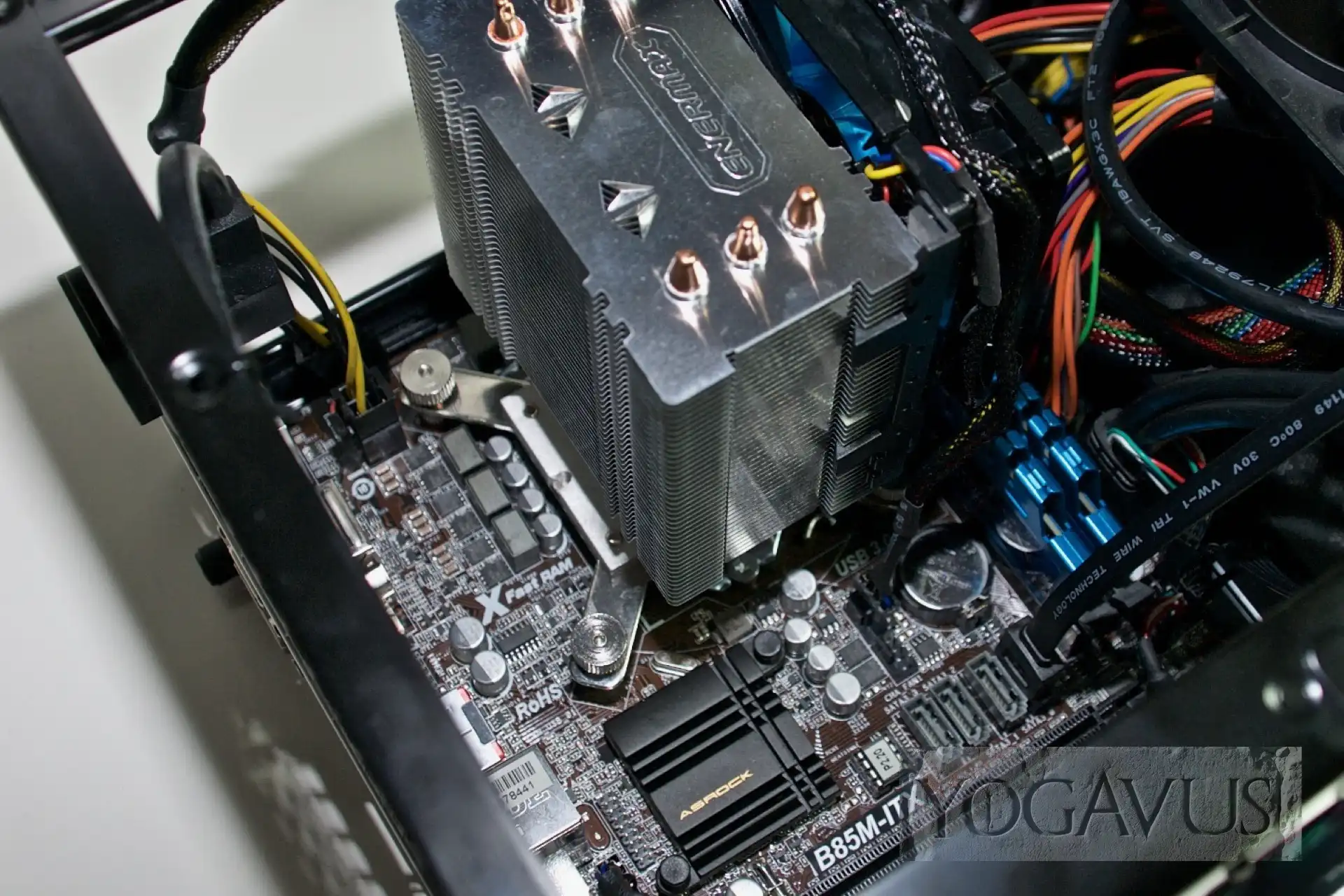 Jetzt sollte man ein Antistatik-Set verwenden: Außerhalb des Gehäuses wird nun am Mainboard die CPU gesteckt und der Enermax Prozessorkühler mittels der diesem Produkt beiliegenden Anleitung montiert. Ich empfehle als Wärmeleitpaste in jedem Fall das in der Liste genannte Arctic MX-2. Das Käbelchen des Lüfters wird passend am Mainboard gesteckt und die beiden Speichermodule kommen jetzt ebenfalls in ihre Slots.