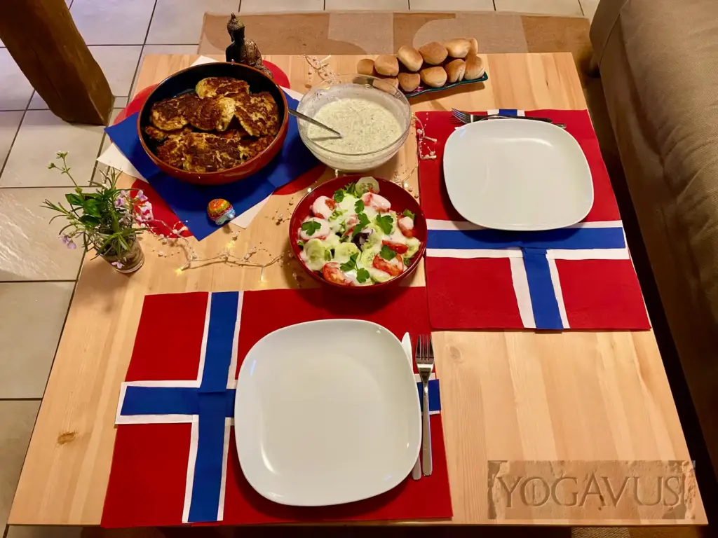 Aus hohen Lüften kommend erreichte heute Morgen unser prima yogischer Flieger den Luftraum Norwegens mit seinen 25.000 Kilometern Küstenlinie und gerade einmal knapp über fünf Millionen Einwohnern. Unser in Okinawa begonnener 8600 Kilometer zählender Himmelsmarsch übers Erdrund geriet abermals zur Bestätigung, dass des Menschen Bestimmung mitnichten die Einsperrung sein kann. So flogen wir ein, in das Land der Wikinger, in die Heimstätte uns hoffentlich hold gewogener Trolle.