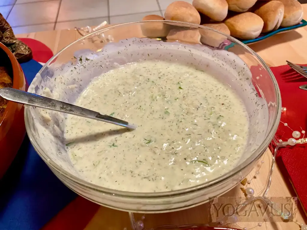 Bereits in Polen führte ein ganz besonderes Kochbuch unsere Gaumen zum Glück. Jens und Miriam, so schrieb ich bereits, betreiben mit der Villa Vegana ein wunderbares veganes Hotel auf Mallorca. Deren Feder entstammt ein großartiges Kochbuch mit veganen Speisen aus aller Welt. Das Werk mit dem Titel „Vegan aus aller Welt – das Villa Vegana Kochbuch“ erschien 2018 im Ventil Verlag. Sehr empfehlenswert! Von dort, zu finden auf Seite 205, stammt das Rezept zum von uns nachgekochten, welch lustiges Wort, Fiskekaker. 🙂 Und, du siehst es auf den Fotos, meines Weibes Zaziki vegan passt zu vielen Situationen des Lebens wie auch exakkkt hier. 🙂