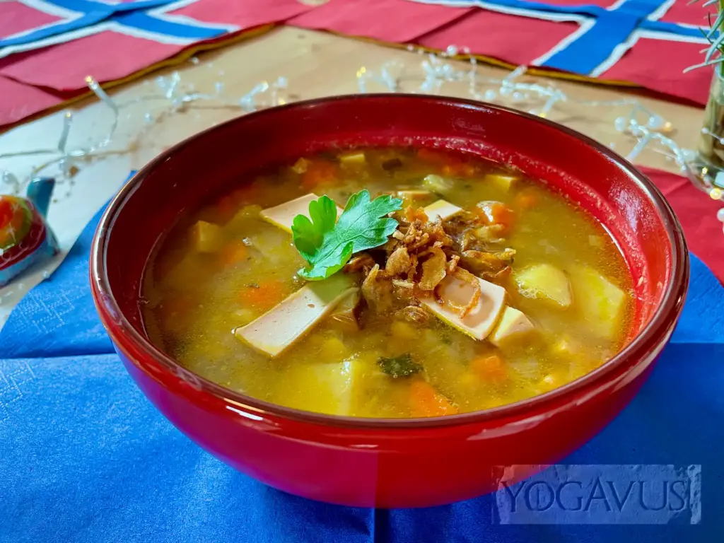 Wie in den lichtesten Momenten der letzten Wochen findet unsere Heimkehr zur Suppe ihre bedingungslose Fortsetzung! Es sind die wohlmeinendsten Götter, welche uns heute die Weltpremiere der von meiner liebreizenden Muse bereiteten norwegischen Erbsensuppe vegan bescheren. Zumal, herrje, welch Zufall, passend zum Reiseziel. 🙂 Schau, dass du schnell das gleiche aromatisch-famose Glück in deiner Küche zauberst, um hiernach mit Augen, Nase und Herz dem simplem Glück nordischer Landen zu verfallen. 🙂
