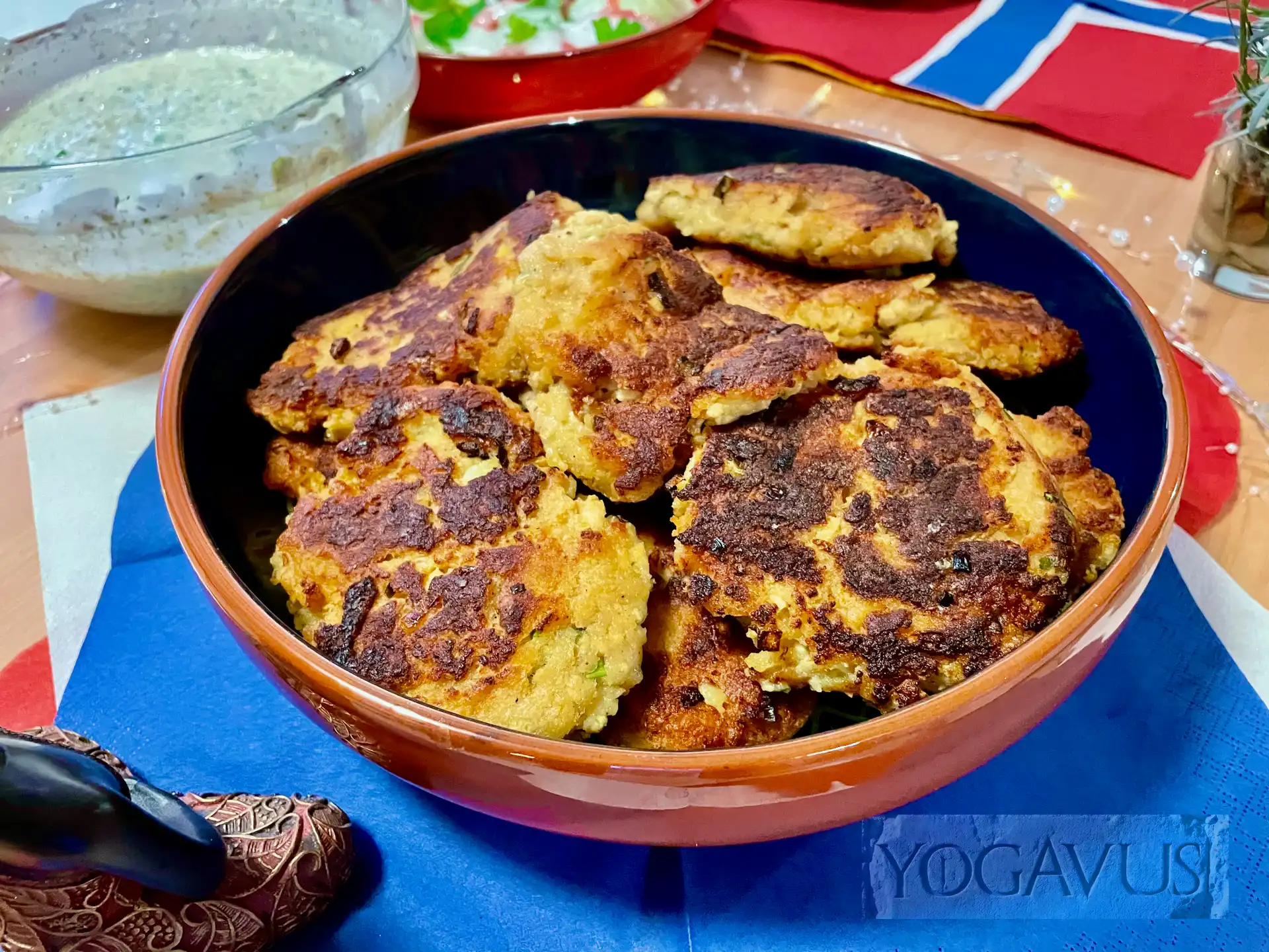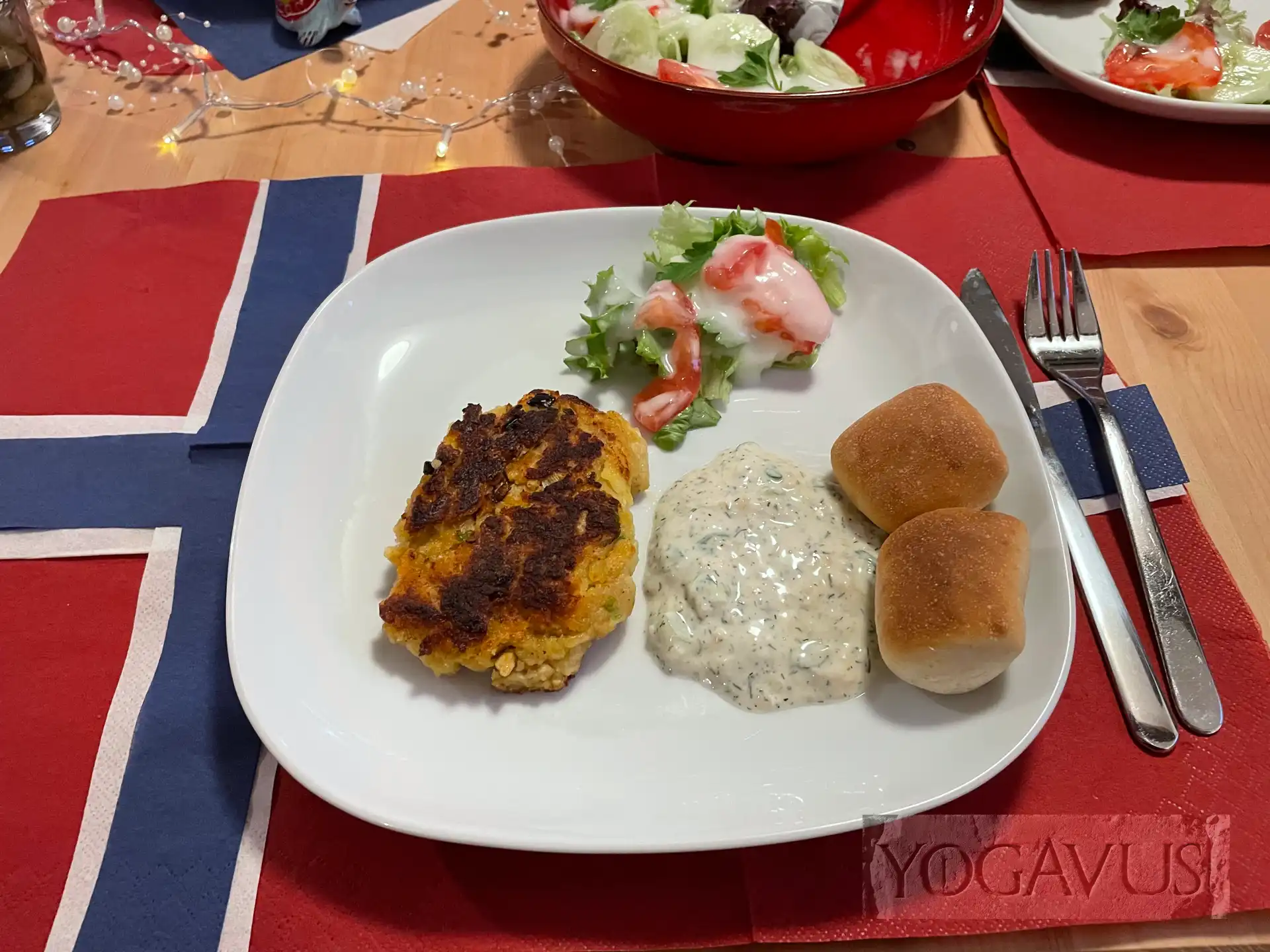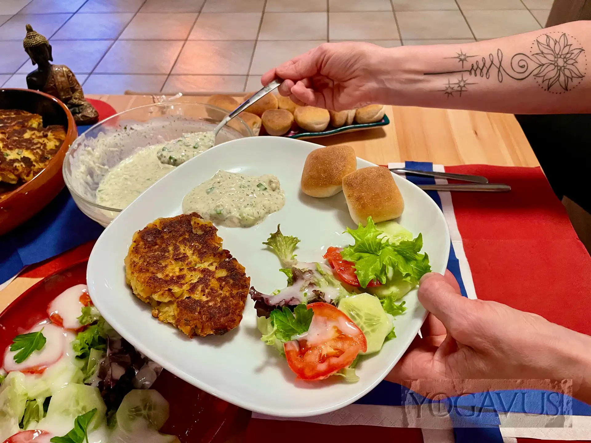 Bereits in Polen führte ein ganz besonderes Kochbuch unsere Gaumen zum Glück. Jens und Miriam, so schrieb ich bereits, betreiben mit der Villa Vegana ein wunderbares veganes Hotel auf Mallorca. Deren Feder entstammt ein großartiges Kochbuch mit veganen Speisen aus aller Welt. Das Werk mit dem Titel „Vegan aus aller Welt – das Villa Vegana Kochbuch“ erschien 2018 im Ventil Verlag. Sehr empfehlenswert! Von dort, zu finden auf Seite 205, stammt das Rezept zum von uns nachgekochten, welch lustiges Wort, Fiskekaker. 🙂 Und, du siehst es auf den Fotos, meines Weibes Zaziki vegan passt zu vielen Situationen des Lebens wie auch exakkkt hier. 🙂