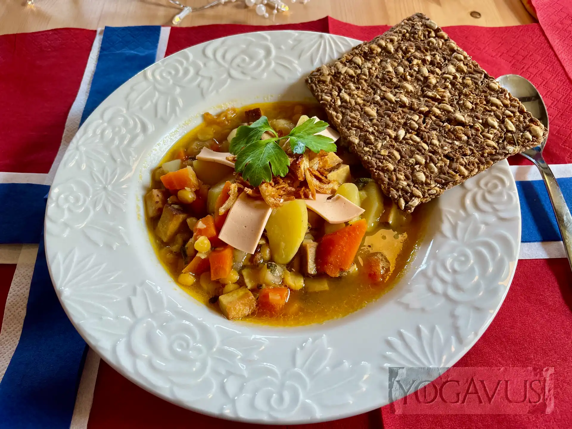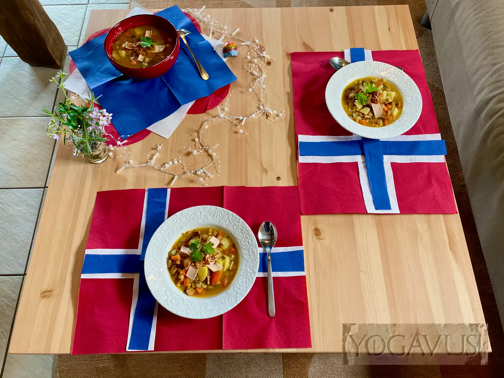 Wie in den lichtesten Momenten der letzten Wochen findet unsere Heimkehr zur Suppe ihre bedingungslose Fortsetzung! Es sind die wohlmeinendsten Götter, welche uns heute die Weltpremiere der von meiner liebreizenden Muse bereiteten norwegischen Erbsensuppe vegan bescheren. Zumal, herrje, welch Zufall, passend zum Reiseziel. 🙂 Schau, dass du schnell das gleiche aromatisch-famose Glück in deiner Küche zauberst, um hiernach mit Augen, Nase und Herz dem simplem Glück nordischer Landen zu verfallen. 🙂