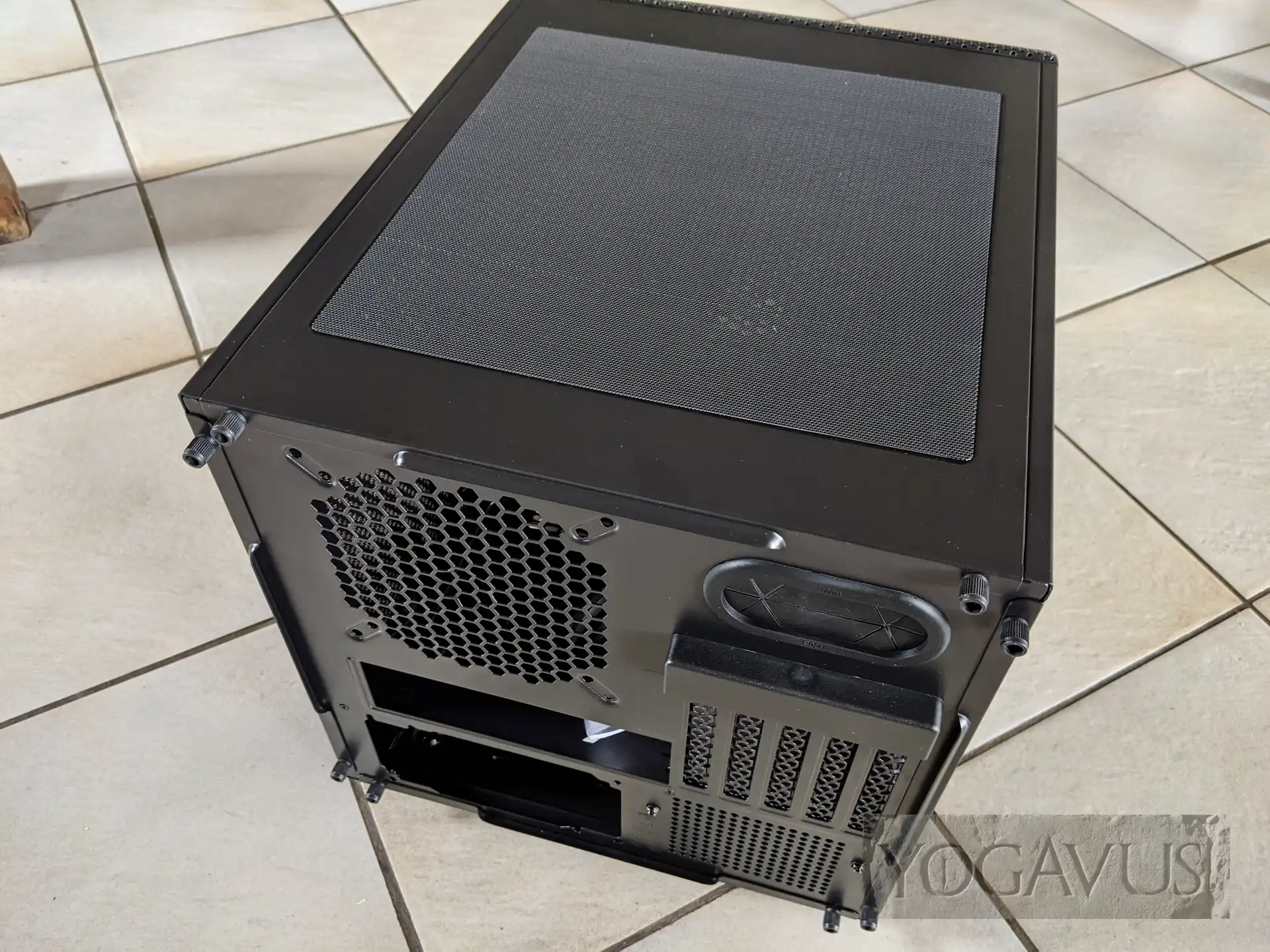 Compañero Marcel vertraute meinem Rat, ein Cube Gehäuse als das richtige Konzept zu sehen für einen gar nicht so leichten Lüfter nebst der dedizierten Grafikeinheit. Vertikal montierten Mainboards mit jahrelang in Richtung Erdmitte am PCB reisenden CPU-Kühlern vermochte ich noch nie großes Vertrauen zu schenken. Der pfiffige Würfel Thermaltake Core V21 macht es besser und er ist zudem komplett und schnell rupfbar, auch im fertigen Zustand.