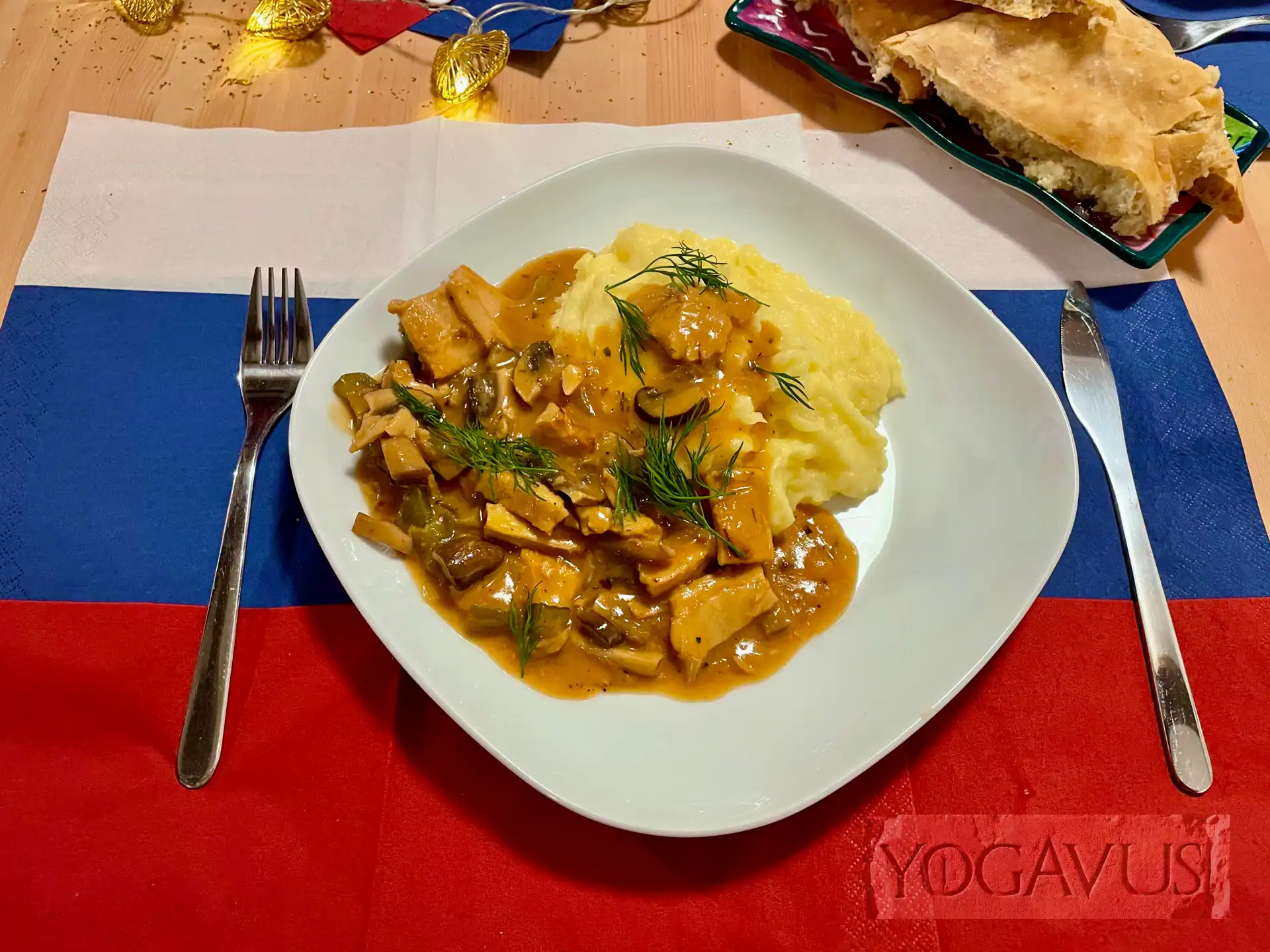 Führ dich nicht in Versuchung und probier die eingelegten Salzgurken nicht so. Ganz ohne Schaudern passen die salzig-sauren Gurkenfreunde jedoch im kulinarischen Abschluss unseres Aufenthaltes hier in Russland. Dass man ein Bœuf Stroganoff auch ohne Rinderfilet und Sauerrahm hinbekommt, davon zeugt meiner Muse famos-fleischlos-glücklichmachendes Rezept Boeuf Stroganoff mit Kartoffelpüree vegan.