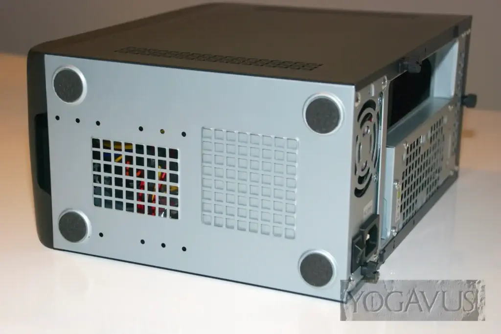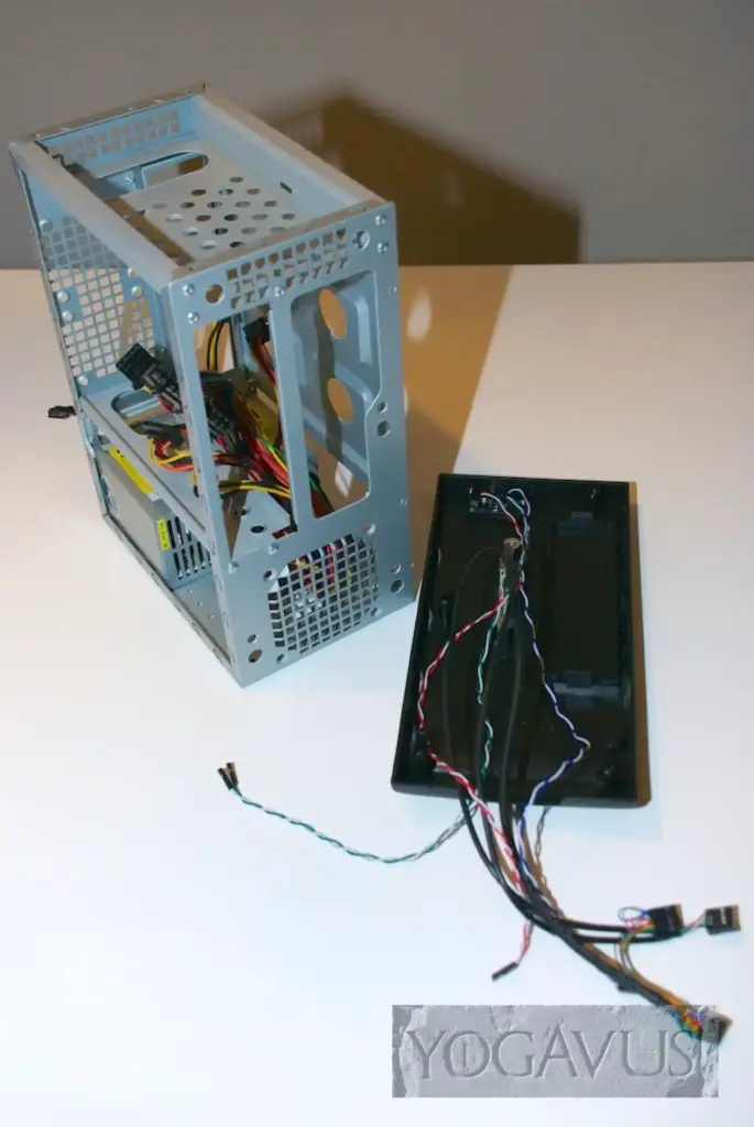 Das Gehäuse hinlegen, die Anschlussblende vom Mainboard in die Aussparung am Gehäuse einklemmen. Arbeitsspeicher in das Mainboard stecken. Nun das Mainboard in die Anschlussblende dirigieren und passend auf den Gewinden der Abstandshalter setzen und verschrauben. Jetzt das 2,5″ Laufwerk nehmen und gleich Strom und SATA-Stecker dort konnektieren. Nun wird das Laufwerk auf dem Gehäuseboden, Aufkleber nach oben, Anschlüsse nach hinten (Richtung Mainboard) so auf den Boden platziert, dass man es von der Gehäuseunterseite her passend verschrauben kann.