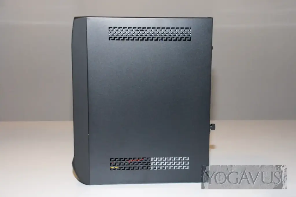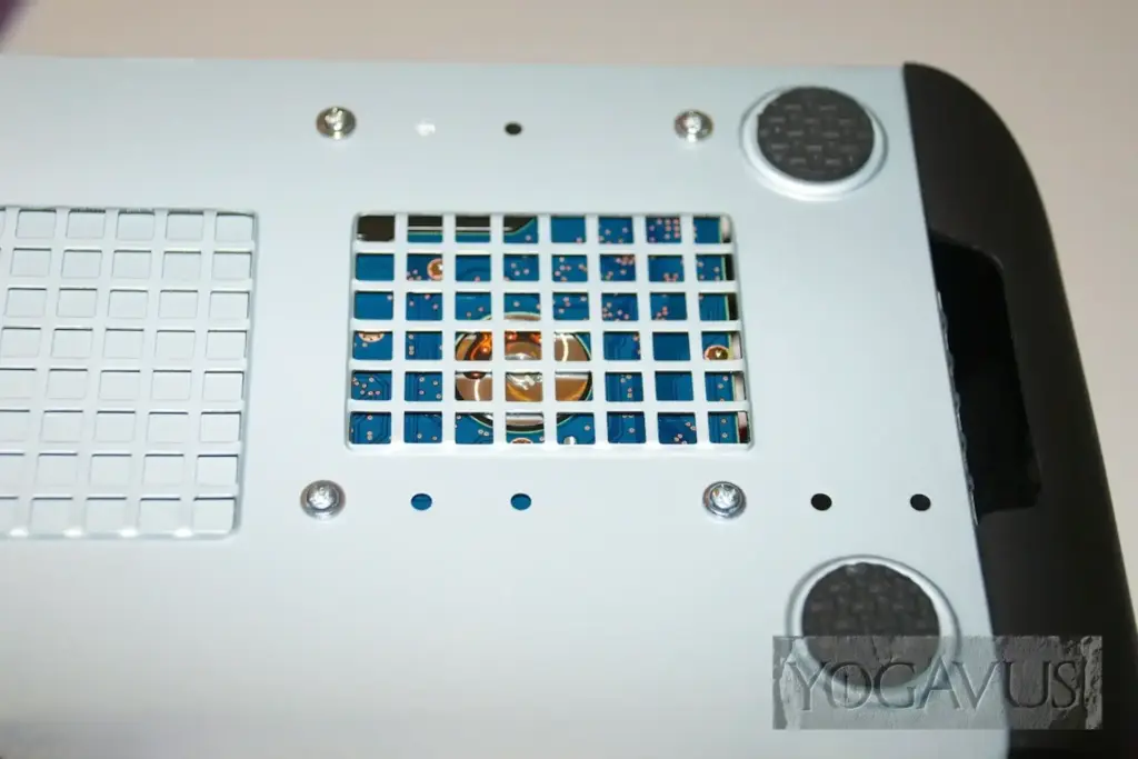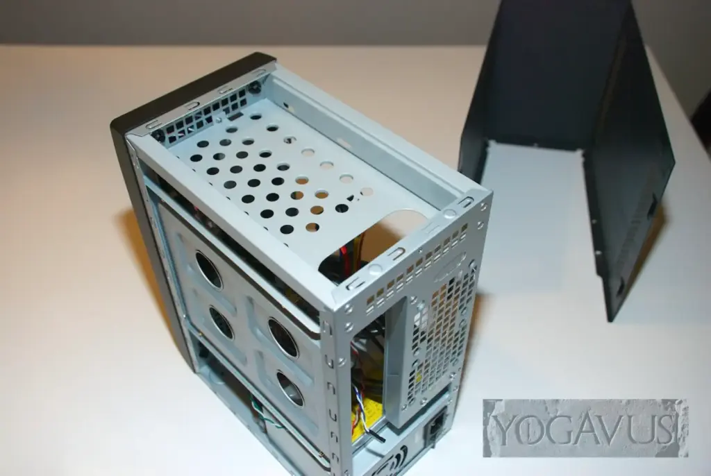 Am schwarzen Gehäuse die hinteren 3 Daumenschrauben lösen und das einteilige Außenteil nach hinten und oben abziehen. Sehr loben will ich an dieser Stelle, dass Chieftec schon ab Werk die Mainboard Abstandshalter fürs Mini-ITX Board gesetzt hat. Nun ziehen wir die Gehäusevorderseite aus Kunststoff vorsichtig ab. Hierzu einfach vorne oben am Plastik anfassen und vorsichtig, aber doch kräftig, vorne vom Gehäuse weg ziehen. Nachhelfen kann man ein wenig mit der freien Hand, welche innen die schwarzen Plastikschrauben des Vorderteils ein wenig zusammendrückt. Mit einem Mal macht es Klack und man hat das gesamte Vorderteil in der Hand. Nun bauen wir das in der Mitte befindliche Blech aus, welches das Gehäuse stabilisiert. Bitte merken, wie es ausgerichtet war. Hierzu werden von hinten und von vorne jeweils die zwei Schrauben gelöst.