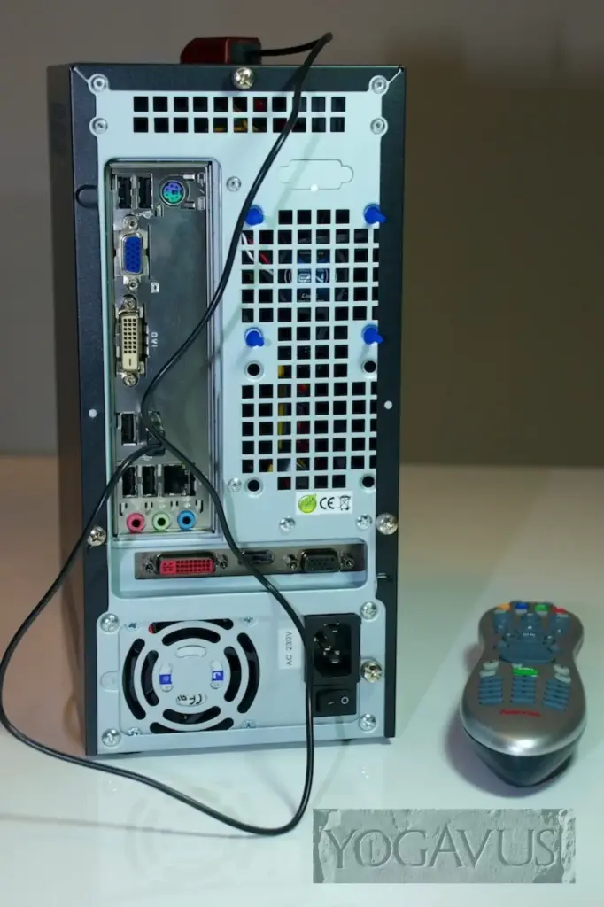 Hinten kommt der USB-Stecker des Infrarotadapteres von der Fernbedienung rein. Der rote Empfänger selbst kann oben aufs Gehäuse gelegt werden. Hauptsache, dieser ‘sieht’ die Fernbedienung. Ethernet anstöpseln, HDMI-Kabel vom Fernseher ebenso und fürs Einrichten von OpenELEC eine Tastatur anstecken. Ist OpenELEC drauf, was übrigens keine 3 Minuten dauert, kann die Tastatur für immer abgezogen werden.
