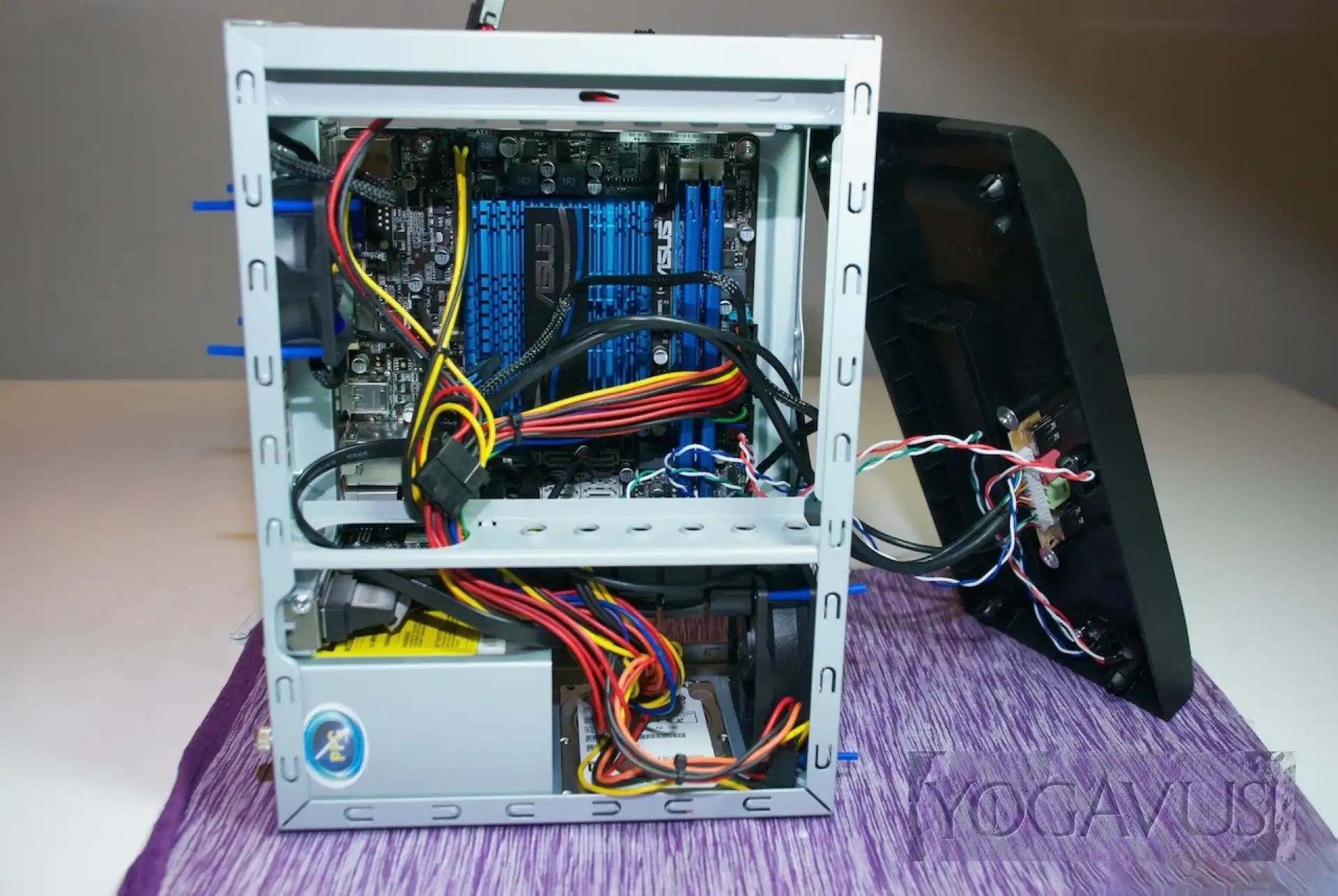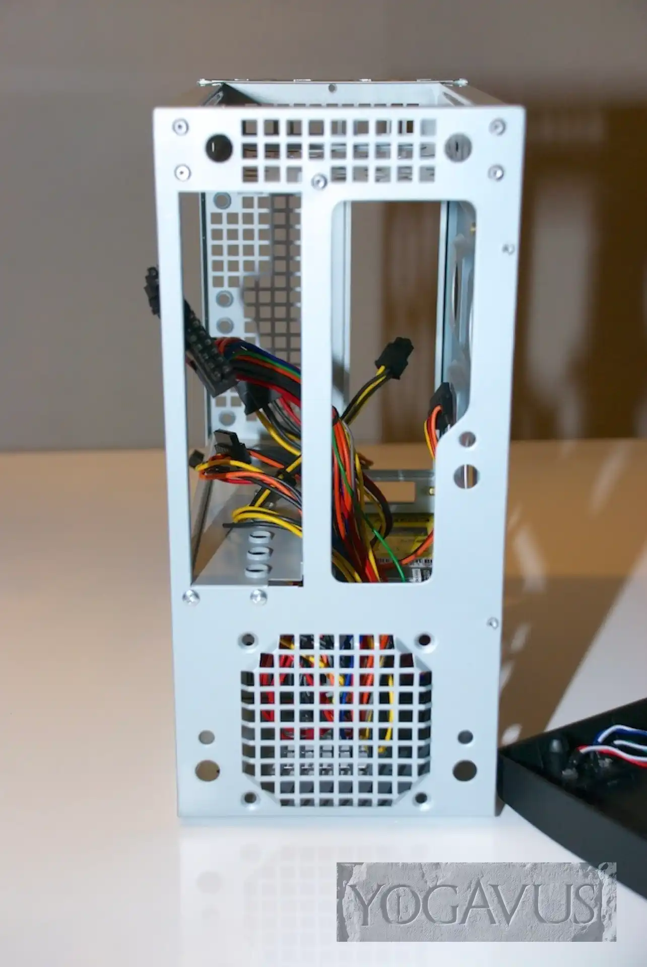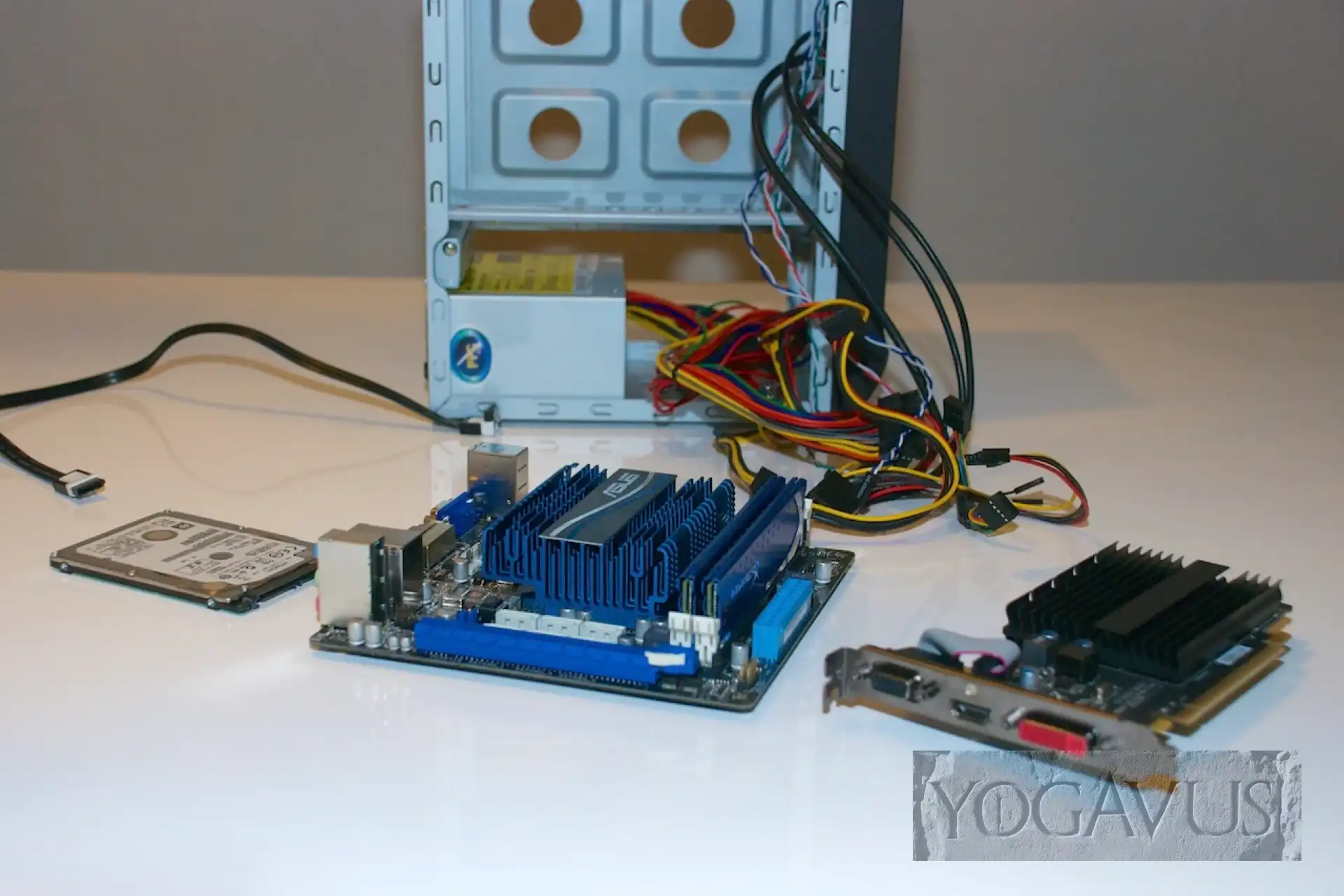 Das Gehäuse hinlegen, die Anschlussblende vom Mainboard in die Aussparung am Gehäuse einklemmen. Arbeitsspeicher in das Mainboard stecken. Nun das Mainboard in die Anschlussblende dirigieren und passend auf den Gewinden der Abstandshalter setzen und verschrauben. Jetzt das 2,5″ Laufwerk nehmen und gleich Strom und SATA-Stecker dort konnektieren. Nun wird das Laufwerk auf dem Gehäuseboden, Aufkleber nach oben, Anschlüsse nach hinten (Richtung Mainboard) so auf den Boden platziert, dass man es von der Gehäuseunterseite her passend verschrauben kann.