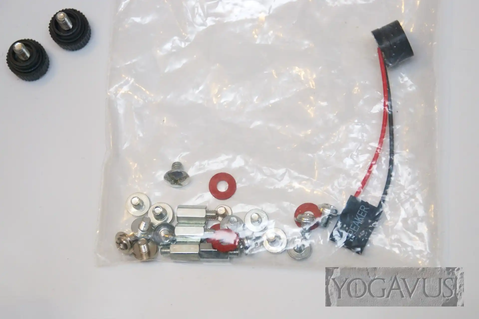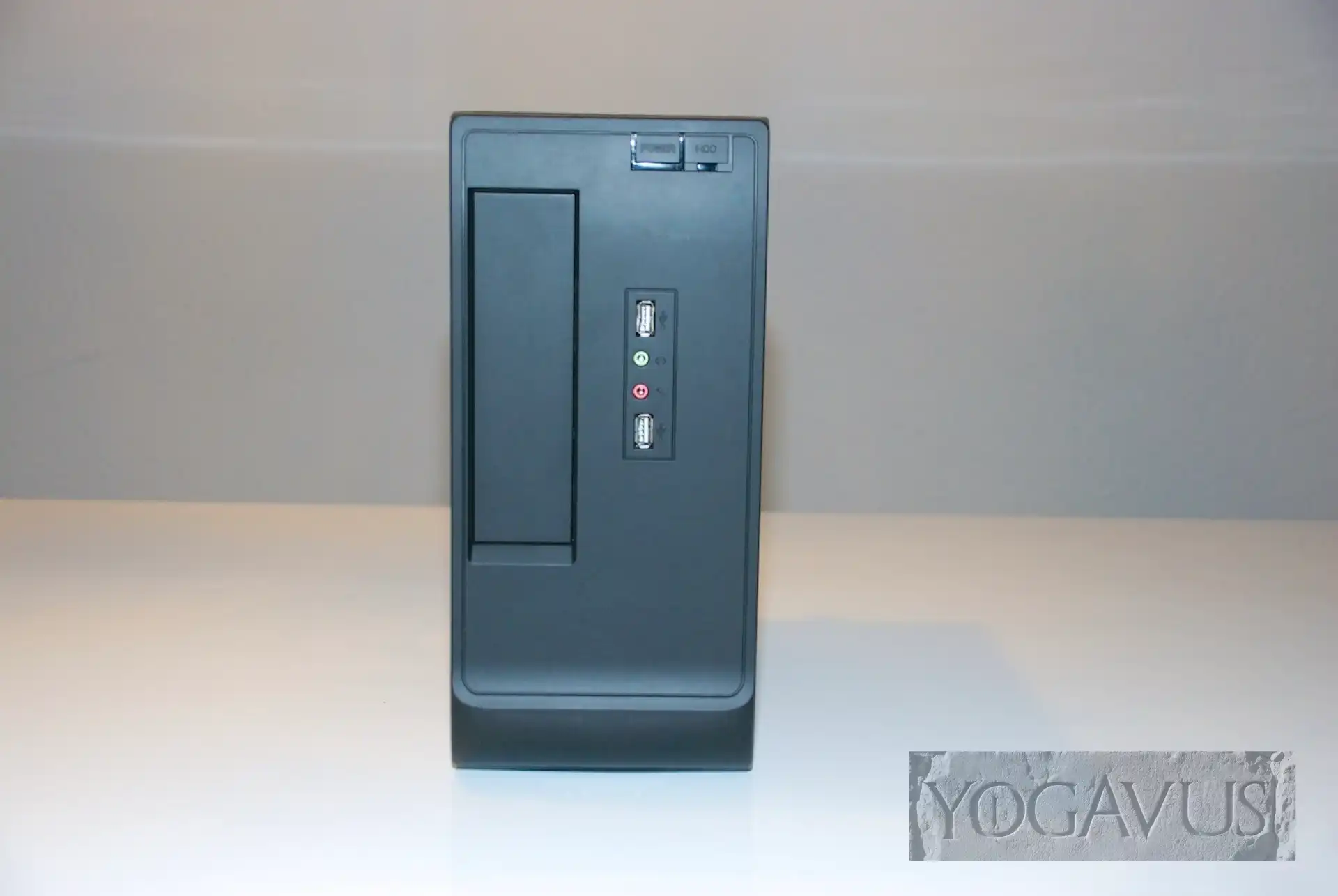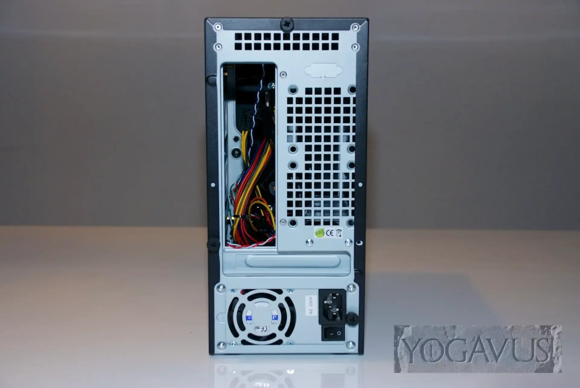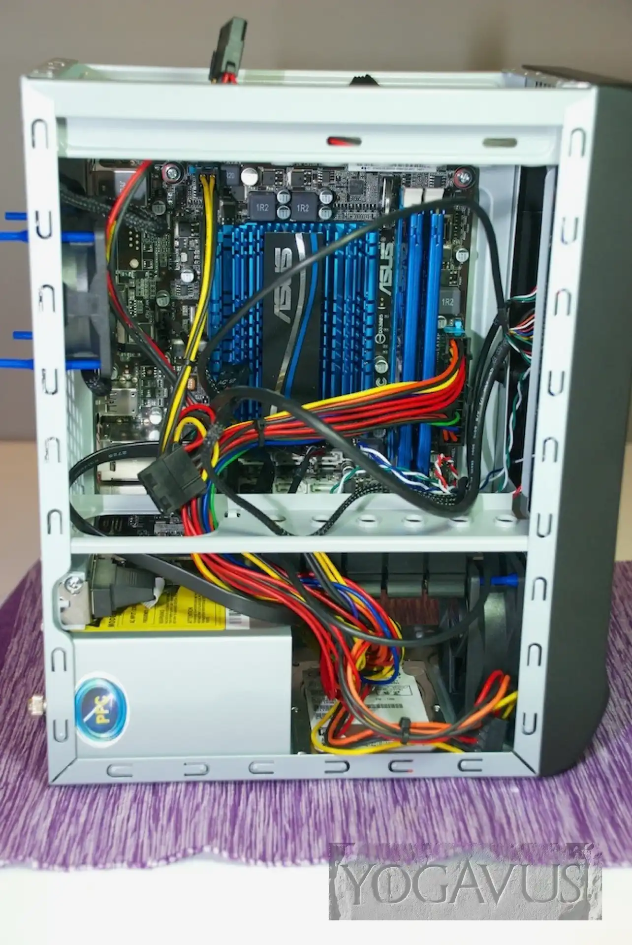 Das Gehäuse hinlegen, die Anschlussblende vom Mainboard in die Aussparung am Gehäuse einklemmen. Arbeitsspeicher in das Mainboard stecken. Nun das Mainboard in die Anschlussblende dirigieren und passend auf den Gewinden der Abstandshalter setzen und verschrauben. Jetzt das 2,5″ Laufwerk nehmen und gleich Strom und SATA-Stecker dort konnektieren. Nun wird das Laufwerk auf dem Gehäuseboden, Aufkleber nach oben, Anschlüsse nach hinten (Richtung Mainboard) so auf den Boden platziert, dass man es von der Gehäuseunterseite her passend verschrauben kann.