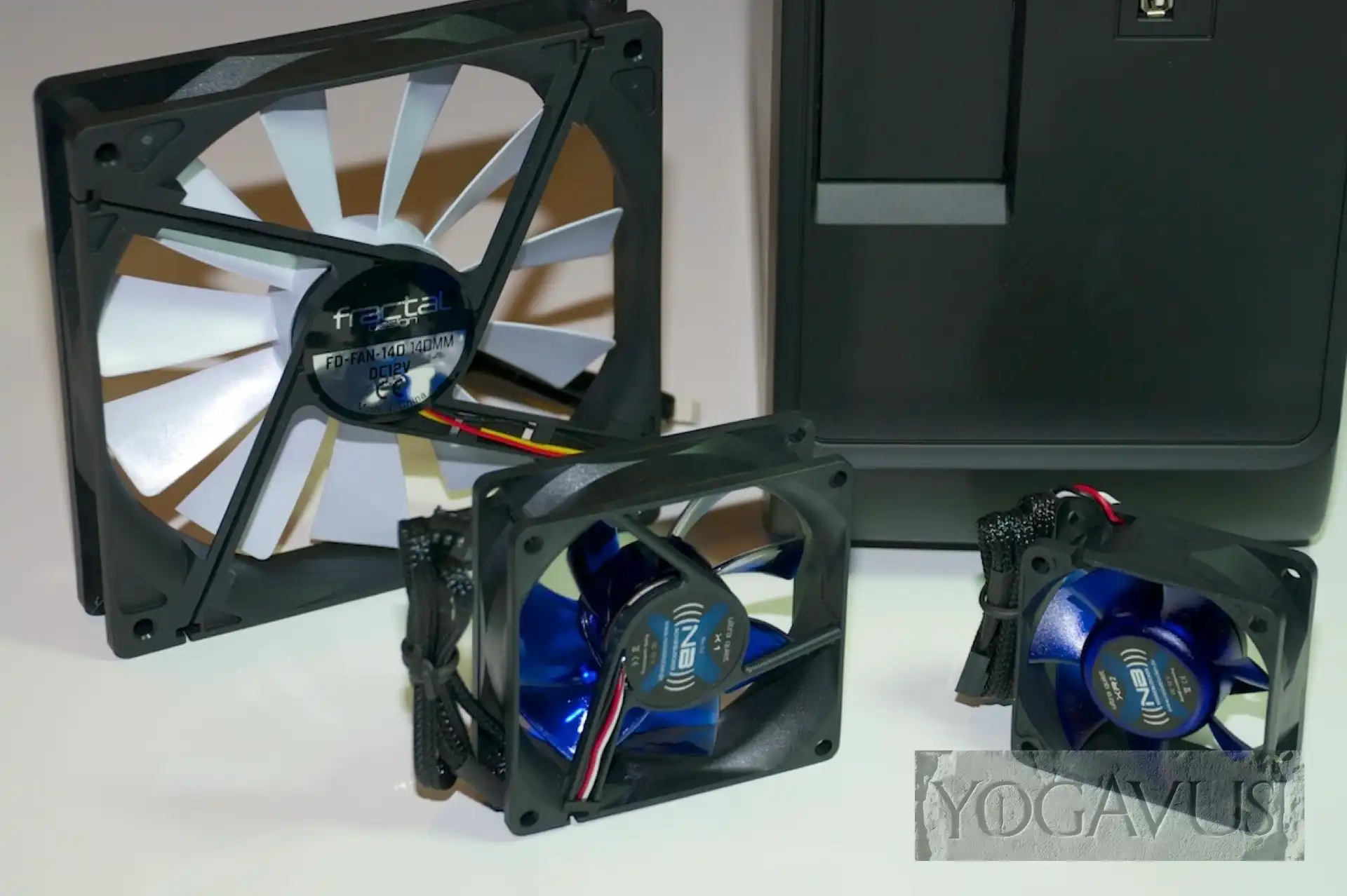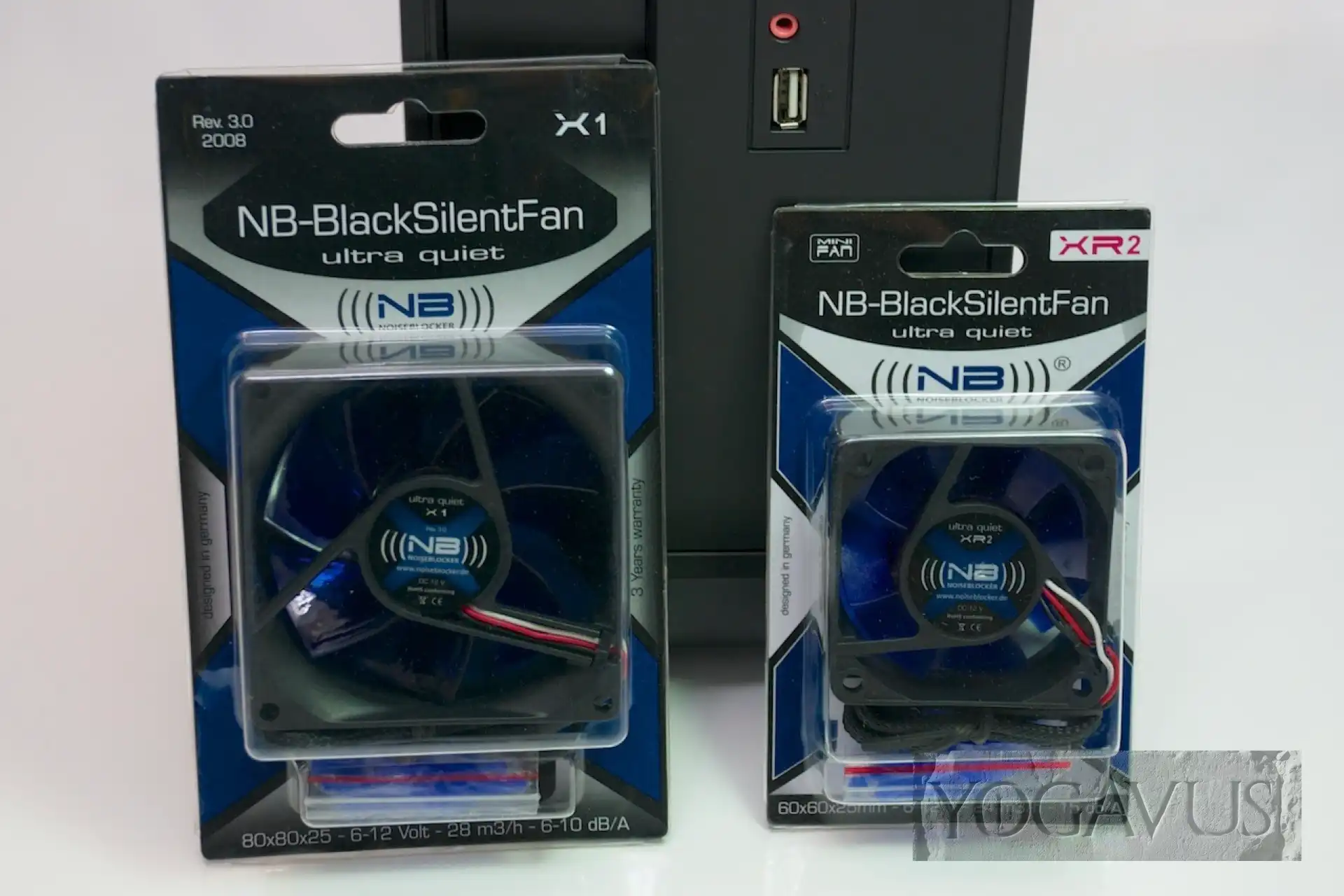 - 2 Gehäuselüfter, einmal Noiseblocker BlackSilentFan XR2 Lüfter (60x60x25) und einmal Noiseblocker BlackSilentFan X1R Lüfter (80x80x25)
