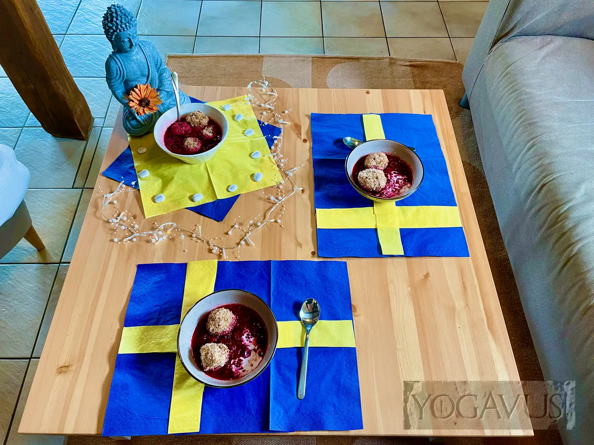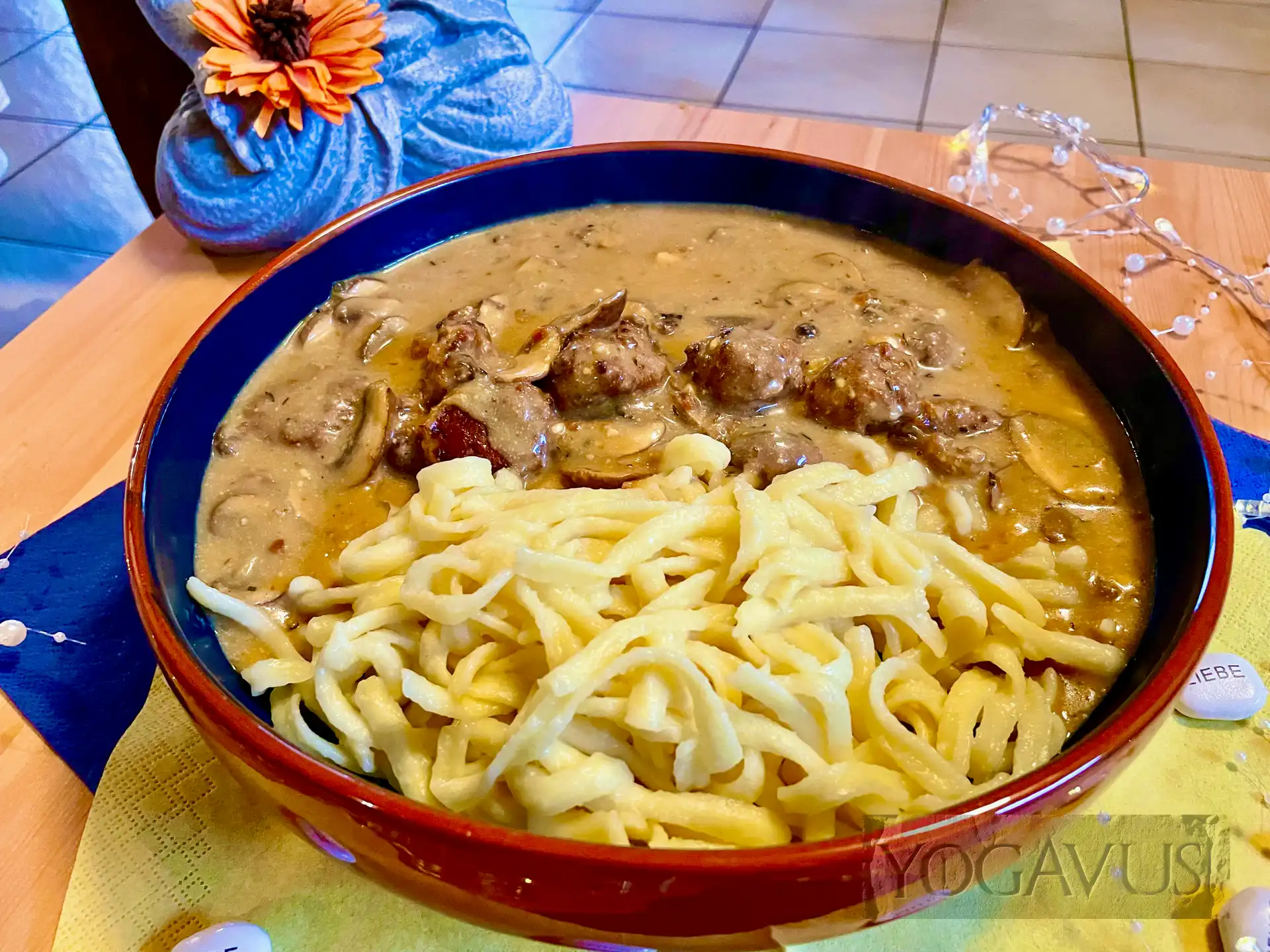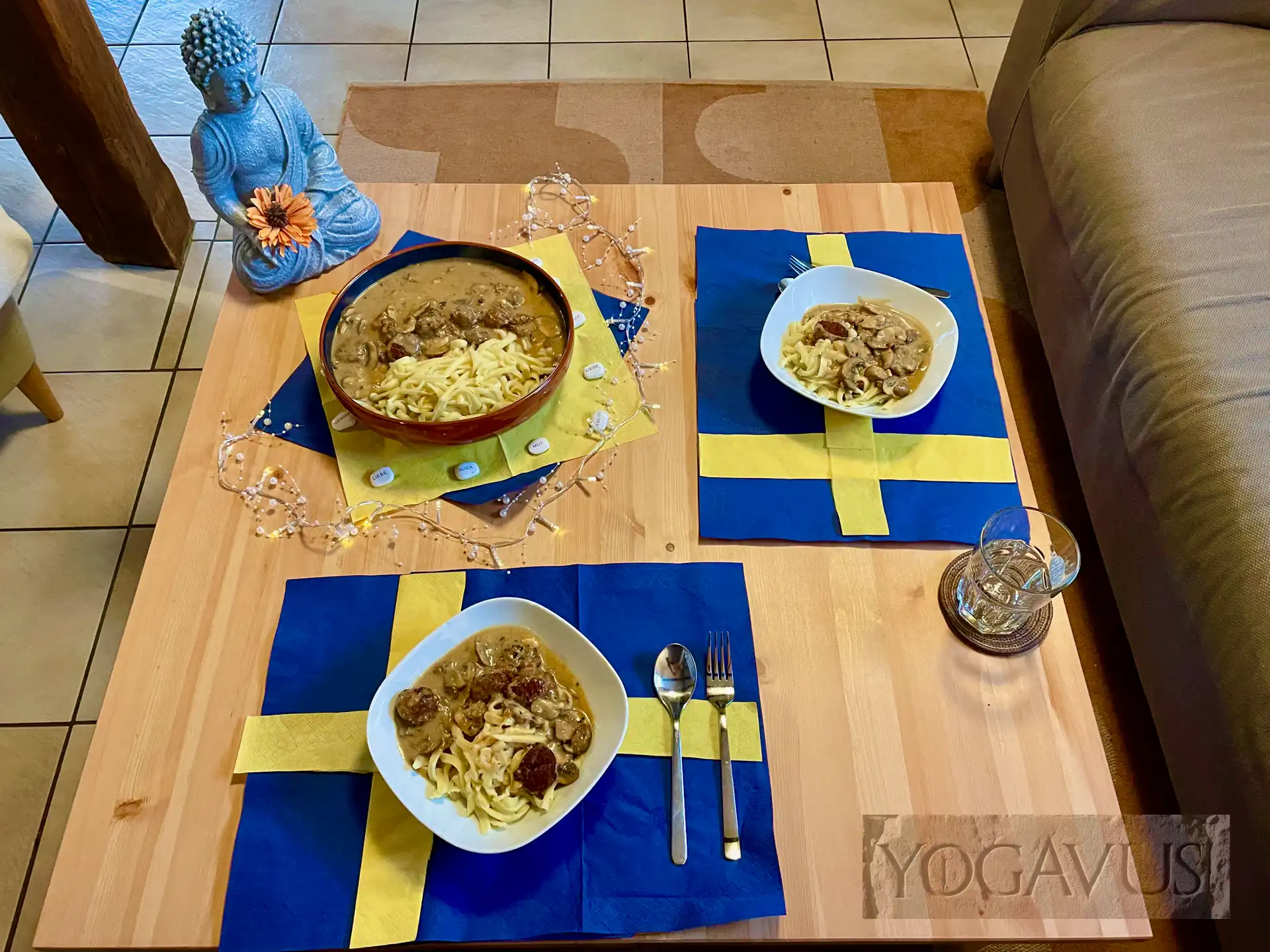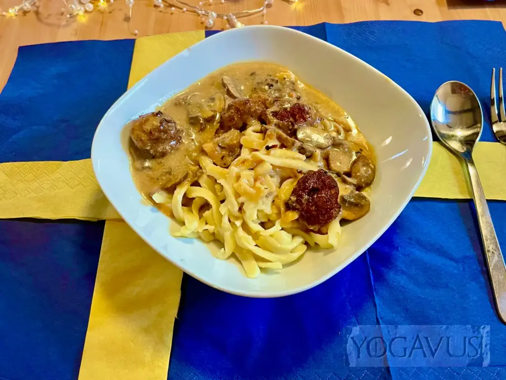 Nach dem Film, oder ruhig schon mittendrin, essen sich vorzüglichst die Köttbullar vegan à la gurunest von Yogavus‘ liebreizender Muse. Die Energie braucht es jetzt, schließlich verlangt der visuelle Kraftakt nach neuer Energie. Drum wollen wir nicht eine Sekunde länger als irgend nötig der Verlockung aus rein pflanzlichen Hackbällchen und rahmgetränkten Spätzle widerstehen.