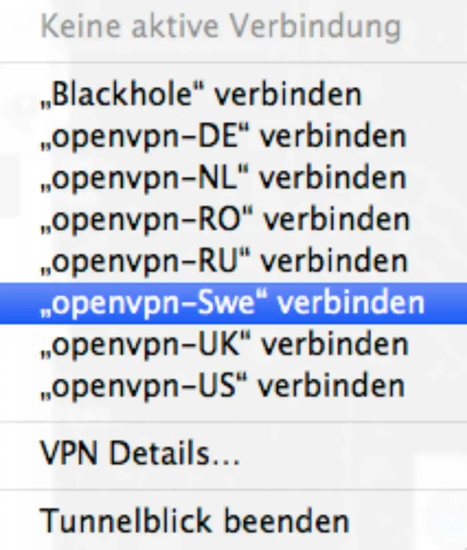 Ein Account bei vpntunnel.se kostet aktuell 5 € im Monat. Ist die Anmeldeprozedur erledigt, so loggt man sich auf der Website ein. Unter dem Punkt ‘Software’ lädt man sich als nächsten Schritt den Mac Client herunter, was dann nichts Geringeres ist als die quelloffene VPN Benutzeroberfläche für Mac OS X namens ‘Tunnelblick’. Das Progrämmchen Tunnelblick kann selbstverständlich auch von Google Code gezogen werden, jedoch empfiehlt sich hier dringend der Download aus dem besagten Bereich auf vpntunnel.se, weil so schon alle erforderlichen Konfigurationen und Zertifikate enthalten sind. Nach dem Download wird Tunnelblick entzippt und nach ‘Programme’ verschoben und gestartet. Oben rechts befindet sich nun neben der Spotlight Lupe das Tunnelblick Icon. Klicken wir dieses Icon, so sehen wir auch schon die verschiedenen VPN-Server, welche wir als vpntunnel.se Kunde nutzen können.