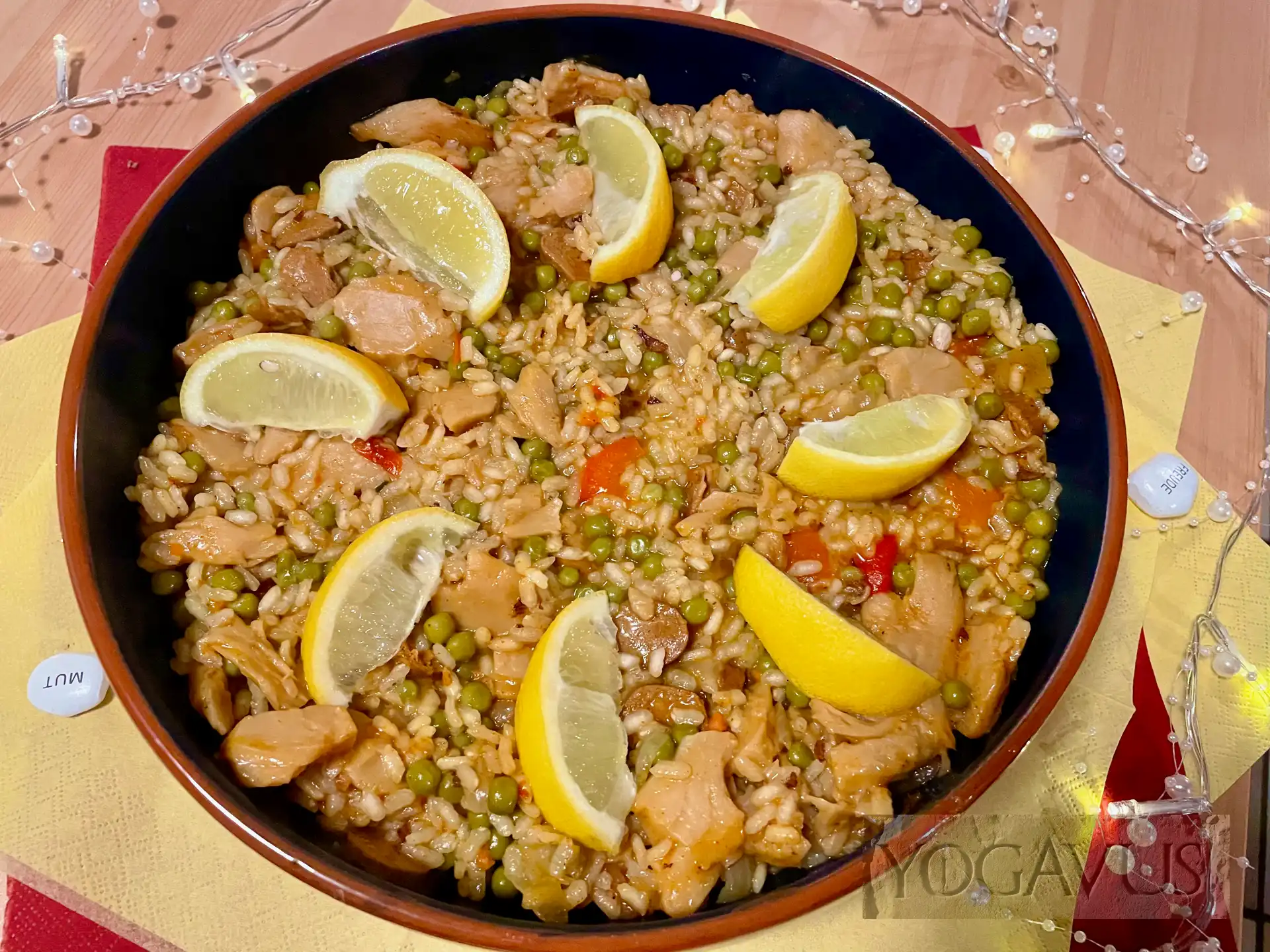 Paella ohne Fische, Gambas, Muscheln, Octopus, Hühner und Kaninchen