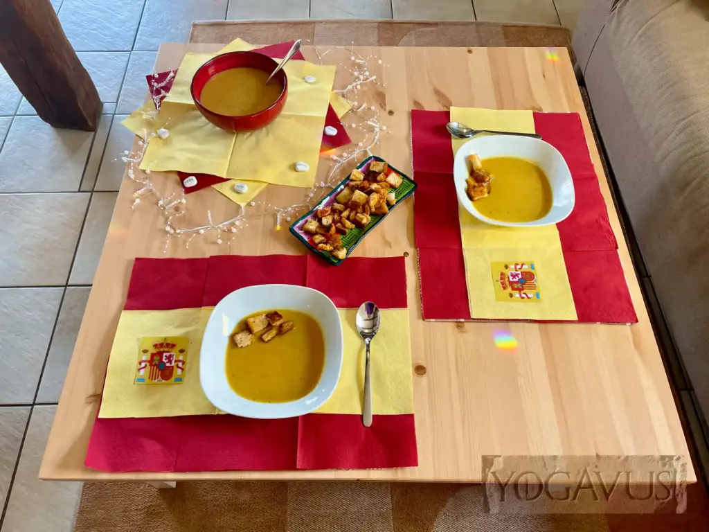 Jeder gute Mottotag hier, du weißt es längst, beginnt mit der lokal geprägten Suppe. Für heute etablieren wir mal das Gegenmodell zum zaghaften Einsatz von Knoblauch. Das ist spaßig, das schmeckt megalecker, sollte aber nicht am Tag vor dem ersten Date oder dem Geschäftstermin passieren. 🙂 Zweiundzwanzig Knoblauchzehen (!!!) für 4 Personen (!) stecken in unserer simpel nachzukochenden Knoblauchsuppe spanischer Prägung. Hier das Rezept: Knoblauchsuppe español vegan.