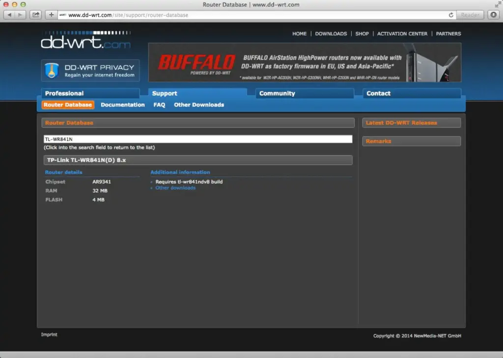 Der graue Geräteaufkleber auf der Unterseite weist unser Exemplar als v8.2 aus. Für unser Gerätemodell ist die Vorgehensweise also, innerhalb des Suchfelds der DD-WRT Router Database den Suchbegriff TL-WR841N einzugeben. Das unterste Ergebnis mit der Zeile Revision 8.x ist für das uns vorliegende Modell richtig. Wir klicken die Zeile und dann ist (für unser v8.2 Exemplar) das hier wichtig: Requires tl-wr841ndv8 build. Entscheidend für uns ist der String tl-wr841ndv8.Wir klicken ‘other Downloads’ , dort den Link zum 2014 Ordner und hier den zum Testzeitpunkt einzig vorhanden Link 01-10-2014-r23320-fix.Diese Schritt-für-Schritt-Sätze mögen erfahrene Tony-Montana-Hacker mit 2-Tasten-Binärtastatur etwas befremden. Laut den E-Mail, die hier so eingehen, schätzen weniger erfahrene Nutzer diese feiner granulierten Beschreibungen umso mehr. Habt darum bitte etwas Nachsicht …