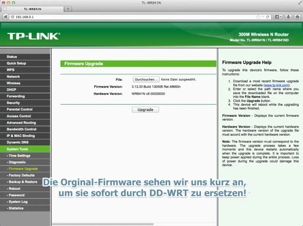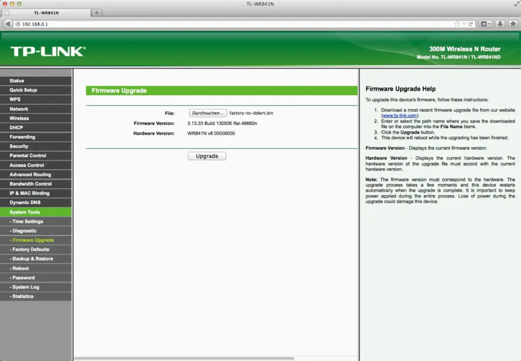 Jetzt gibt es eine lange Dateiliste und aha, der für uns wichtige Eintrag tplink_tl-wr841ndv8 findet sich auch. Diesen klicken wir und die erste Datei namens factory-to-ddwrt.bin ist die für unser v8.2 Gerät richtige Firmware. Diese per Download auf den eigenen Rechner holen. Wir gehen also in die (noch vorhandene) TP-LINK Administration des Geräts und bringen unter System Tools > Firmware Upgrade mit Klick auf ‘Durchsuchen’ unsere vorab geladene Factory-to-ddwrt.bin Datei ein, denken nochmal genau nach, ob nicht irgendwelche Denkfehler passiert sind und klicken sodann auf den Upgrade Button. Nun nix anfassen und zum großen Admin beten, dass kein Stromausfall just in diesem Moment passieren möge.