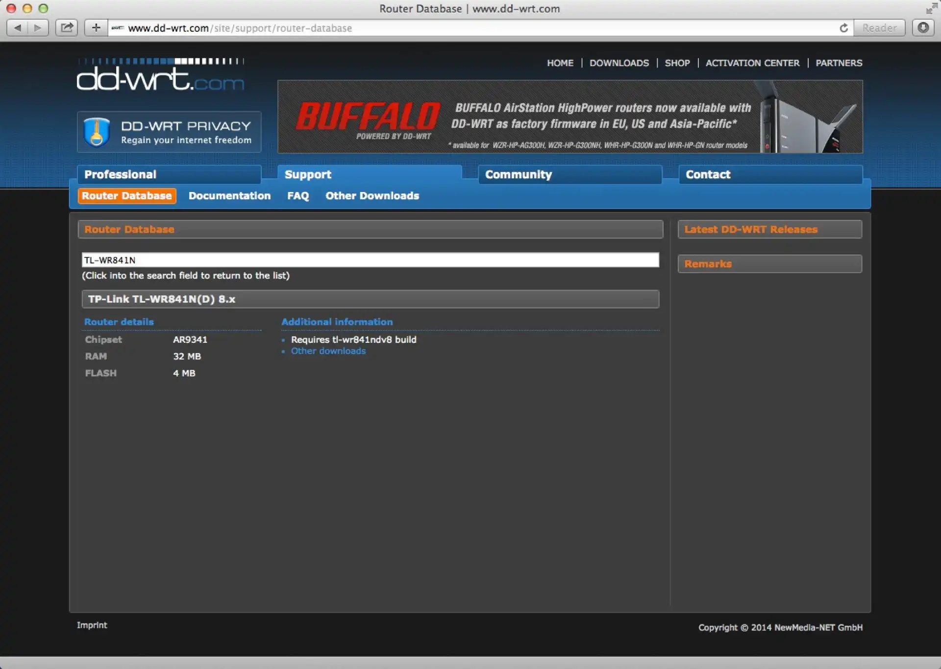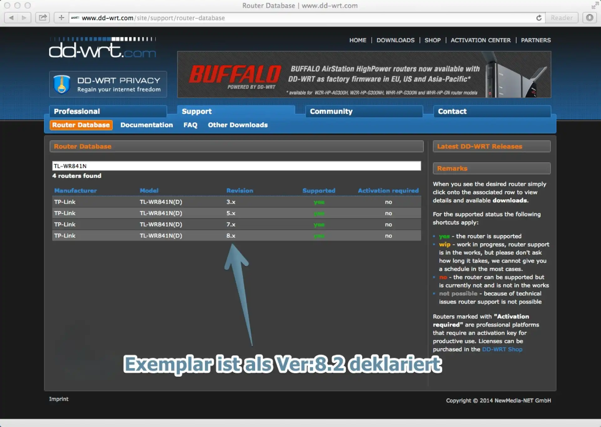 Der graue Geräteaufkleber auf der Unterseite weist unser Exemplar als v8.2 aus. Für unser Gerätemodell ist die Vorgehensweise also, innerhalb des Suchfelds der DD-WRT Router Database den Suchbegriff TL-WR841N einzugeben. Das unterste Ergebnis mit der Zeile Revision 8.x ist für das uns vorliegende Modell richtig. Wir klicken die Zeile und dann ist (für unser v8.2 Exemplar) das hier wichtig: Requires tl-wr841ndv8 build. Entscheidend für uns ist der String tl-wr841ndv8.Wir klicken ‘other Downloads’ , dort den Link zum 2014 Ordner und hier den zum Testzeitpunkt einzig vorhanden Link 01-10-2014-r23320-fix.Diese Schritt-für-Schritt-Sätze mögen erfahrene Tony-Montana-Hacker mit 2-Tasten-Binärtastatur etwas befremden. Laut den E-Mail, die hier so eingehen, schätzen weniger erfahrene Nutzer diese feiner granulierten Beschreibungen umso mehr. Habt darum bitte etwas Nachsicht …