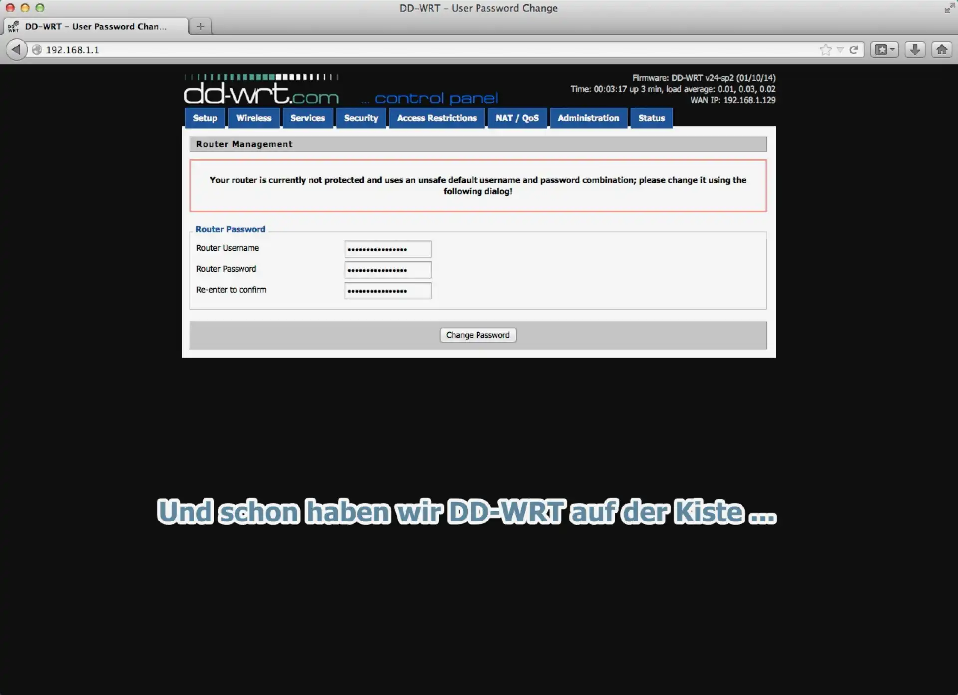 Macht nix. Wir ermitteln also mit dem schicken LanScan Pro die gegenwärtige Adresse des TL-WR841ND im lokalen Netz und kommen so endlich ins Setup des schmucken TP-LINK Routers. Man kann natürlich auch in seiner Firewall, seinem Haupt-Router, was-auch-immer …, nachschauen, welche IP der neue weiße TL-WR841ND gerade innehat. Es wird die Vergabe eines neuen Passworts gefordert und wir sind drin, in der TP-LINK Admin-Oberfläche. Allerdings nur für kurz, denn wir wollen das Betriebssystem ersetzen durch unser liebgewonnenes DD-WRT.