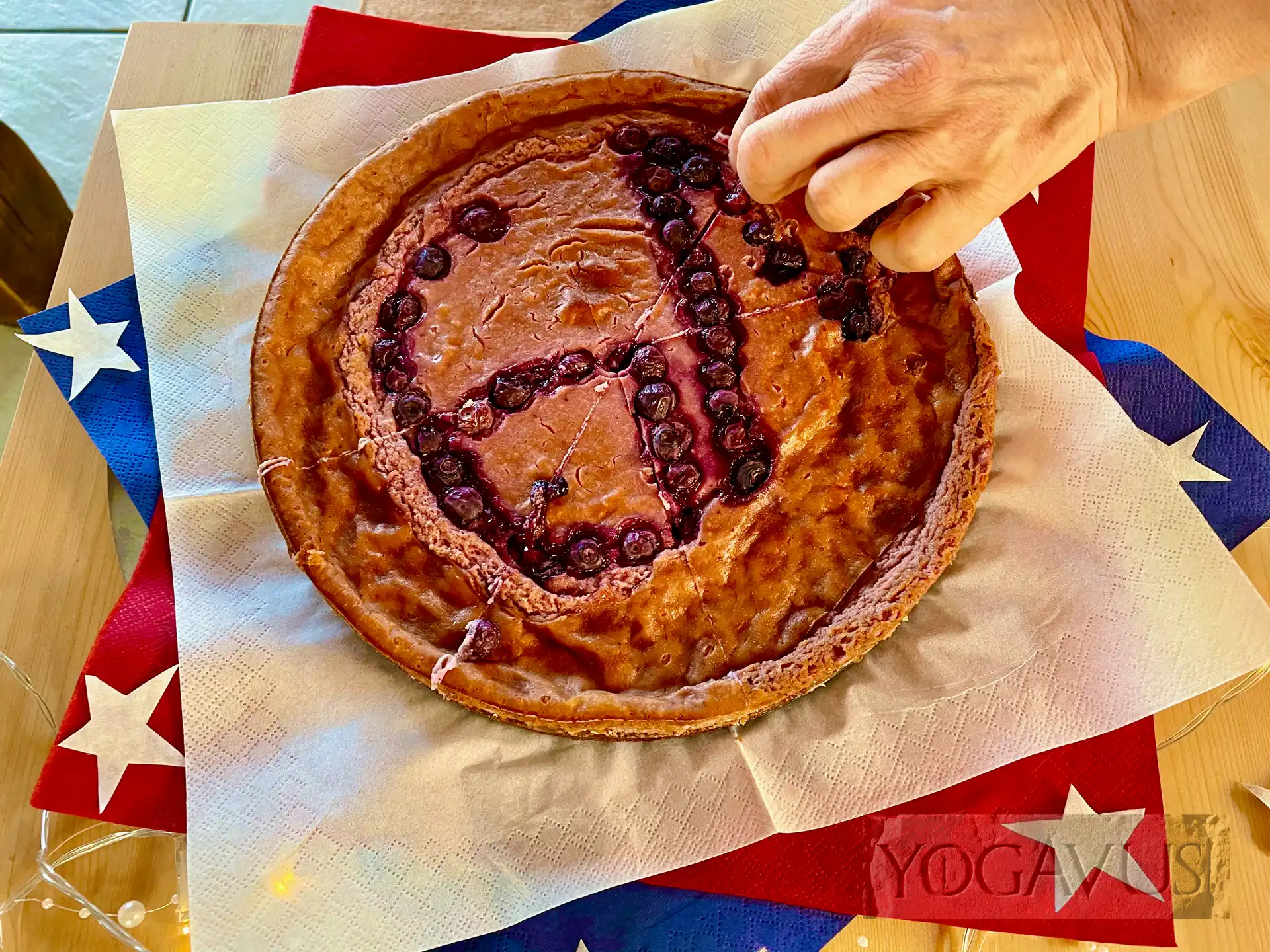Das Rezept wird deinen kundigen Händen schnell leckeren Erfolg bescheren. Denk nur daran, dass du in der heutigen Cowboyvariante unseres veganen Käsekuchens die Zutat 500g Alpro Zitronenjoghurt durch 500g Alpro Heidelbeere (auch eine Soja-Joghurtalternative) ersetzt. Obendrauf lässt du, bitte schon vor dem Backgang, eine Handvoll williger Heidelbeeren rieseln. Ruhig in sinnhaftem Muster.