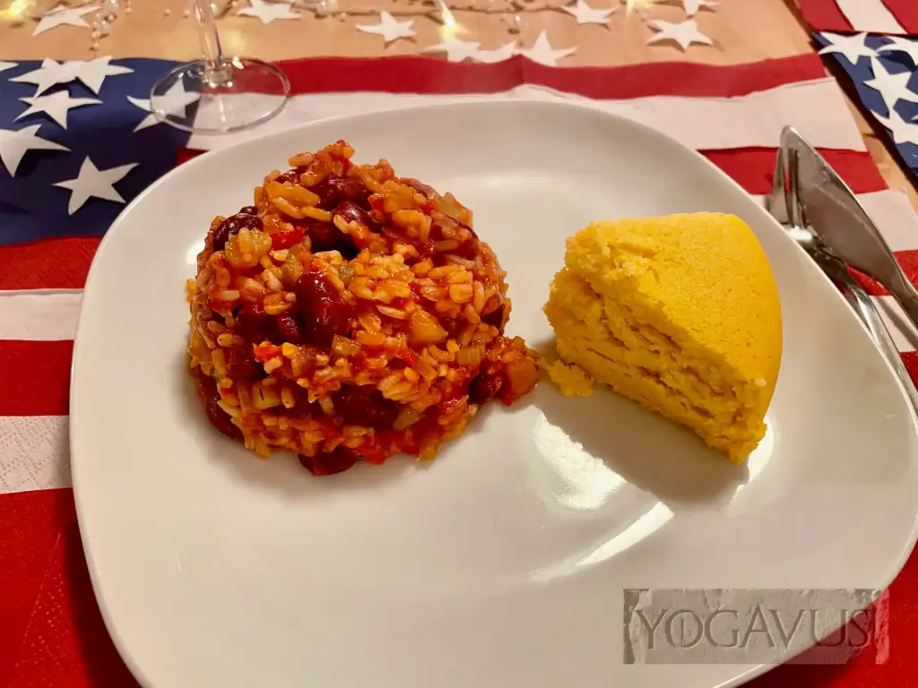 Reis ist immer gut, zumal gut würzig wie in dem von hier hergenommenen Rezept. Genossen mit dem in diesem Kontext quasi unverzichtbaren Maisbrot, Rezept hier, findet unser robust amerikanischer Essenskanon des heutigen Tages einen würdigen Abschluss. Rein pflanzlich, ohne Tierleid, einzig richtig.