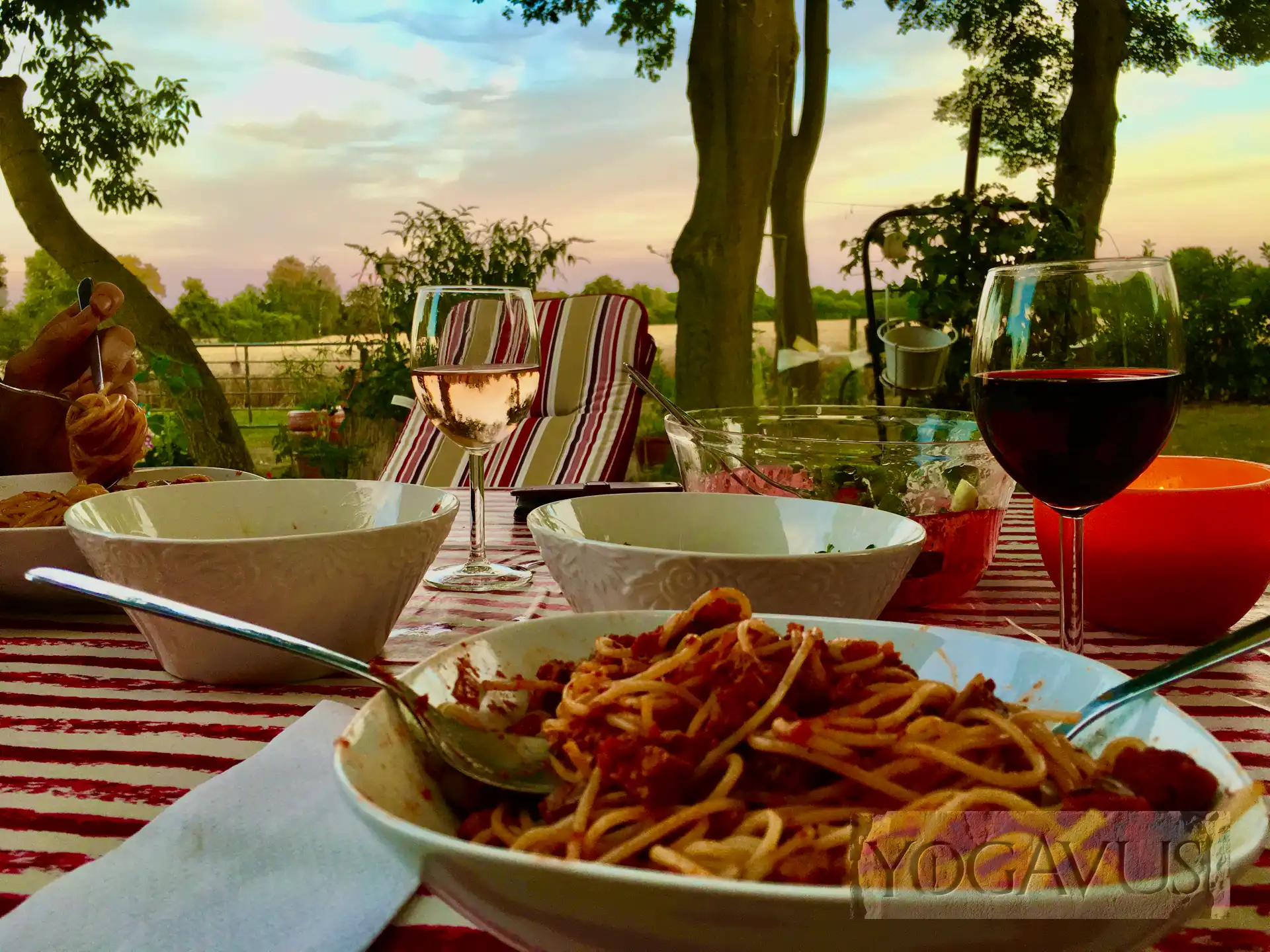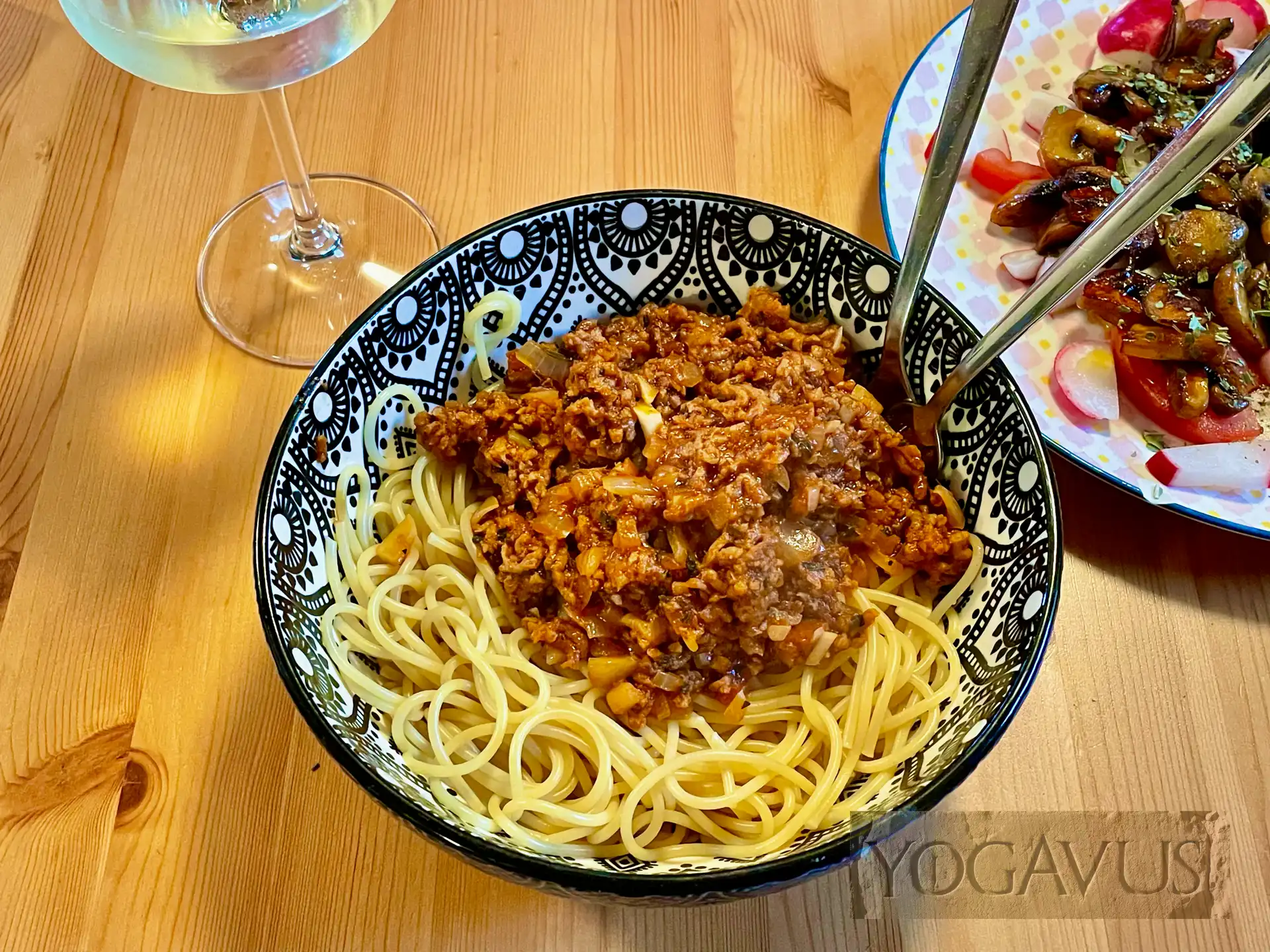 Die Nachrichten haben das alles verstärkt, anstatt uns zu befreien. Indem wir sie ignorieren, gewinnen wir unsere Souveränität zurück. Wir schaffen Raum für Glück, das nicht von externen Ereignissen abhängt, sondern aus dem Inneren sprudelt. Sinn entsteht nicht durch Information, sondern durch Erfahrung – durch das Fühlen der Erde unter den Füßen, das Teilen von Lachen, das Erkennen der Seele in allem. Als unüblicher Yogi getraue ich mich auch zu sagen, dass hier auch der Genuß von wunderbarem Rotwein zu einem (oder zwei) prima Teller Spaghetti-Tofubolognese meines veganen Lieblingskochs einen Platz hat.