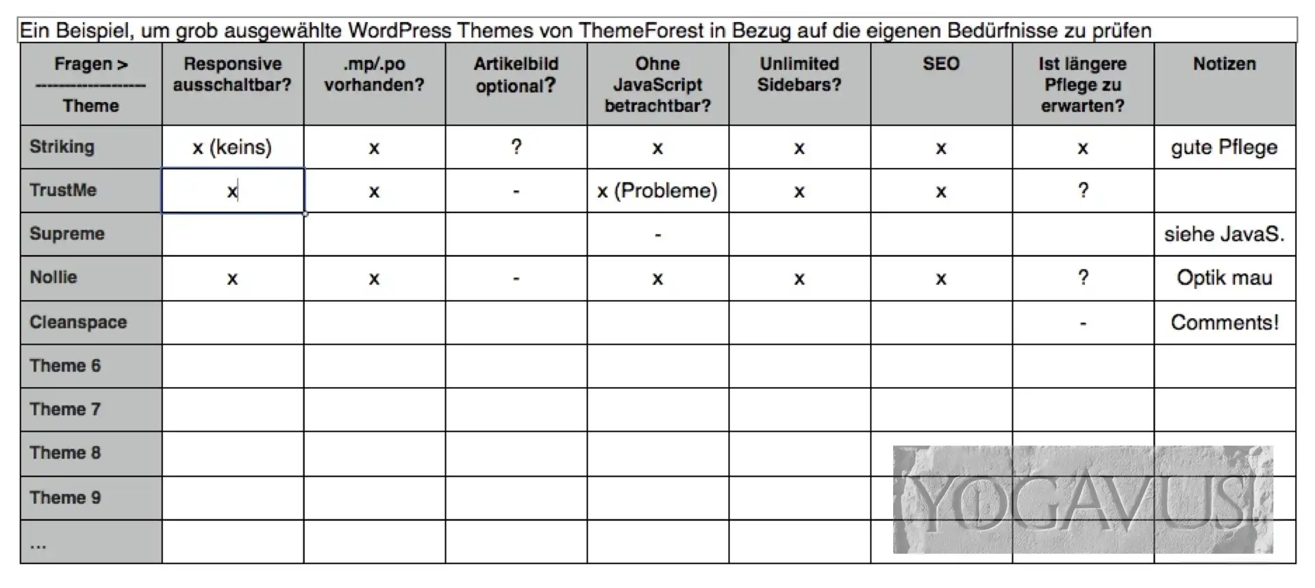Nehmt nach der Vorauswahl Eurer Themes, bei der es natürlich um die reine Optik geht, am besten Stift und Papier zur Hand. Zeichnet eine Tabelle mit den für Euch wichtigen Auswahlkriterien. Prüft das Vorhandensein der einzelnen Punkte im jeweiligen Theme und tragt es ein. Hiernach trennt sich schon sehr schnell die Spreu vom Weizen. Bei den verbliebenen Themes überfliegt ihr möglichst alle vorhandenen Kommentare auf der Verkaufsseite. Aus den Fragen, aber insbesondere auch aus den Antworten der Themeentwickler kann man eine ganze Menge ableiten. Hier ergibt sich oft erst das Zutrauen ins Theme oder eben die kalte Gewissheit, dass man von diesem Design die Finger lassen sollte.
